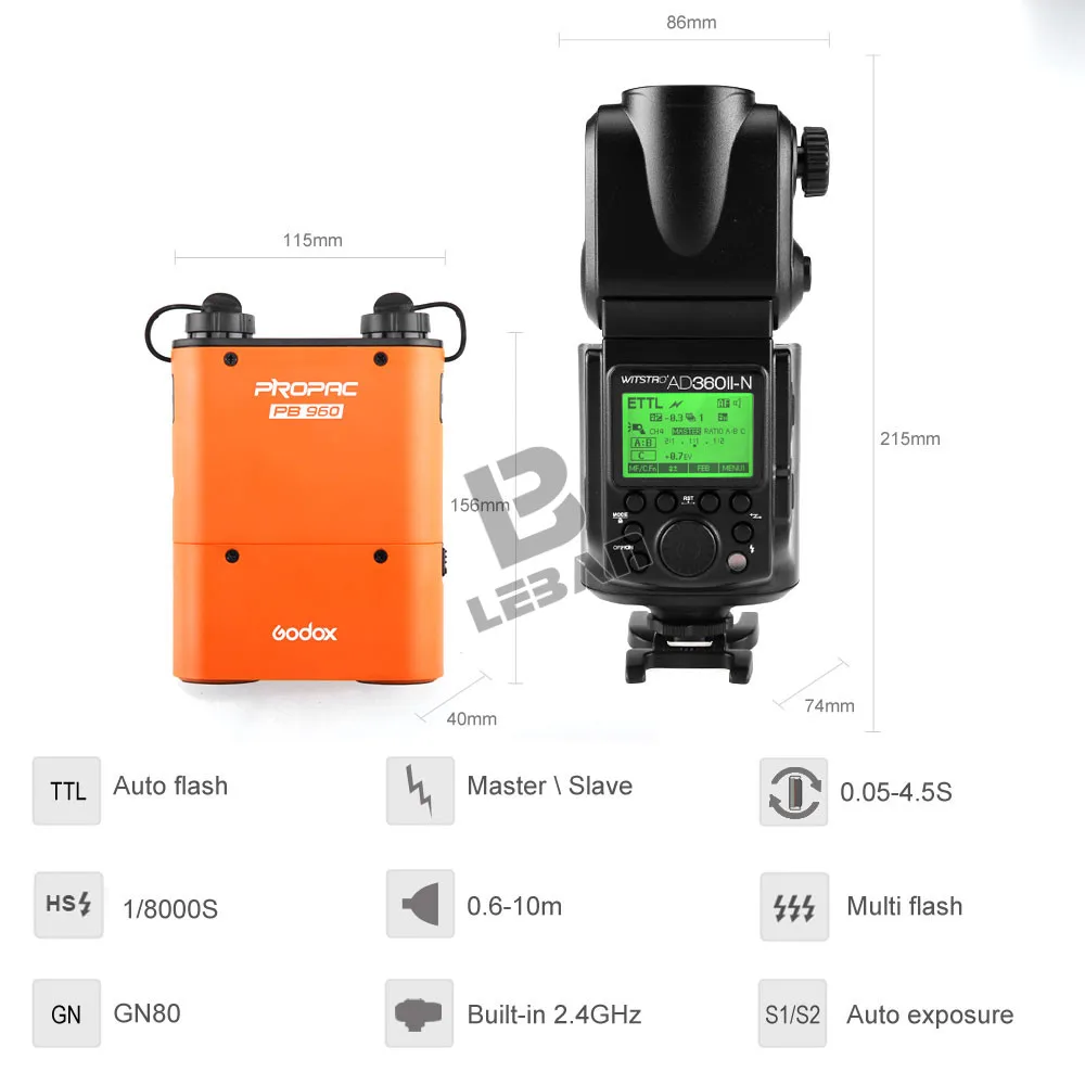 Мощная Вспышка Godox Witstro AD360II-N TTL 360W GN80 + литиевая батарея PB960 4500 мА ч для камеры Nikon (AD360II-N)