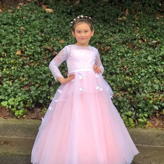 Детское Сетчатое платье с длинным рукавом, с цветами, для девочек, розовое, с бабочками, для причастия, От 1 до 14 лет