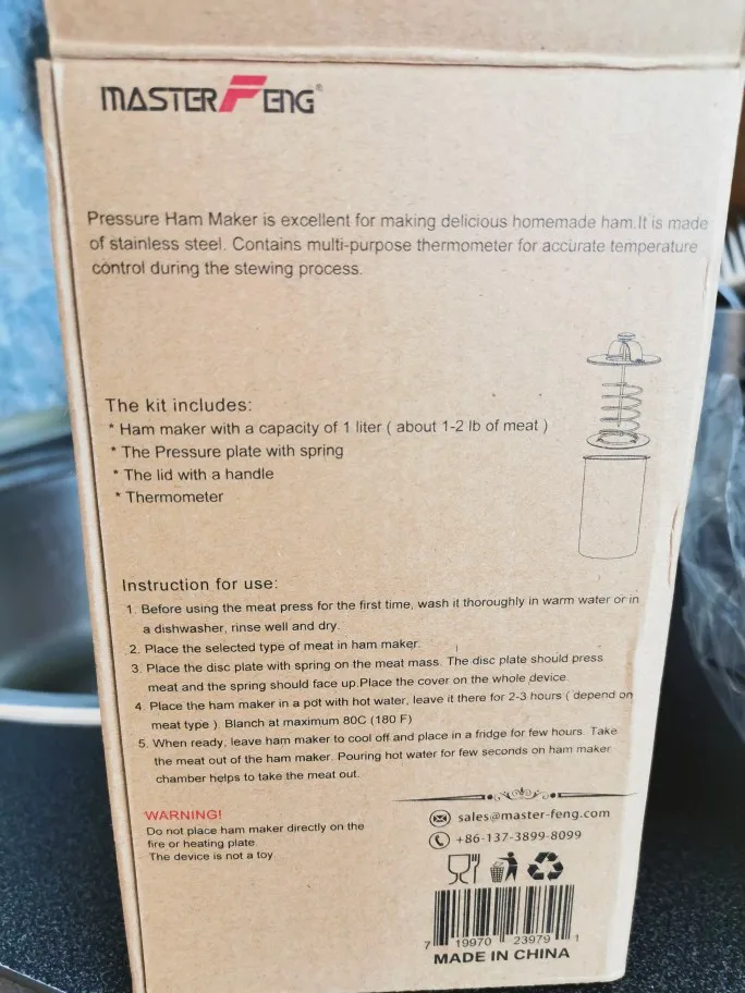 Доставка почтой России 5 дней. Штука неплохая, сразу опробовал. Делал из куриного мяса- входит ровно 1 кг, +- 50-70 г. Торопился, поэтому уложенный фарш в холодильнике не выдерживал, поставил готовить сразу; желатин не добавлял. Ну и готовил при 85 градусах (термометр работает корректно), около двух часов- в следующий раз температуру сделаю 80 град.(вода не должна кипеть!) Готовил без пакета, прямо в ветчиннице, поэтому выдавилось достаточно много сока, который желировался. При извлечении продукта выяснилось, что прижимающая крышка перекосилась и часть фарша по краю оказалась над ней- но в принципе не критично- все умялось, все сготовилось. Для первого раза с наскоку получилось хорошо. В следующий раз попробую в пакете. И еще можно попробовать в духовке при 80 градусах. В общем: впечатления самые положительные. Хороший аппарат! Продавцу- спасибо!