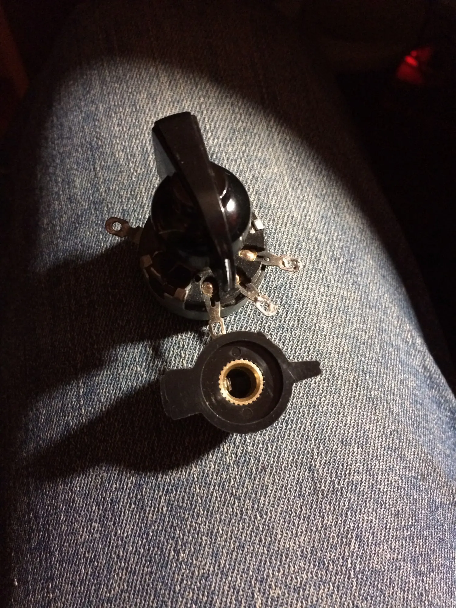 Настоящий бакелит. Качественно и солидно выглядит. На совковом потенциометре сидит идеально. Втулка бронзовая на вал 6мм. На вал 6,35мм уже не влезут, имейте в виду. Поджимает вал длинный винт под плоскую отвертку. Так что должно затянуть даже если на валу есть шлиц или вал меньшего диаметра. Белые риски можно смыть ацетоном или растворителем, бакелит не пострадает. Рекомендую!