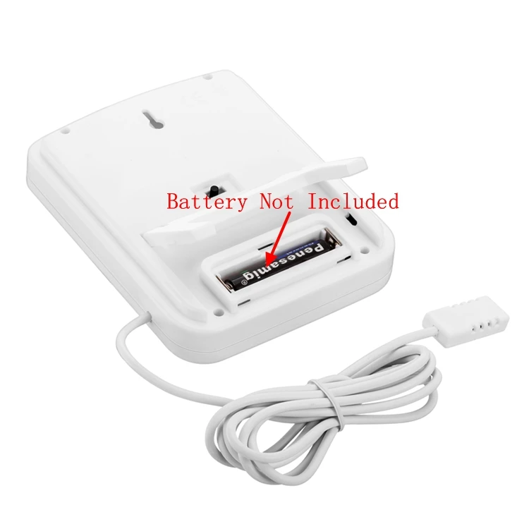 Характеристики:Наружный диапазон температур: 0 °C ~ + 50 °C (32 °F ~ + 122 °F)Влажность: 10%-95% относительной влажностиНачисление: +/- 1 °CУровень влажности: +- 5% относительной влажностиВес: 158 гРазмер: 122*97*24 ммОткрытый светодиодный провод питания: 1,5 мПитание: 1 х AAA батареи (не входят в комплект)