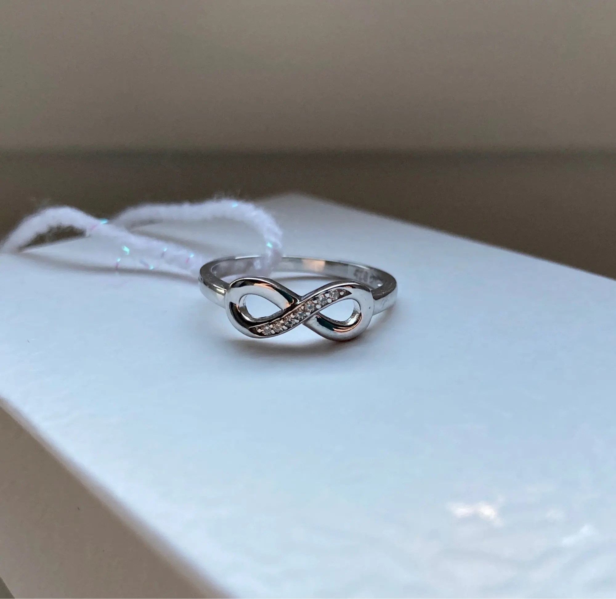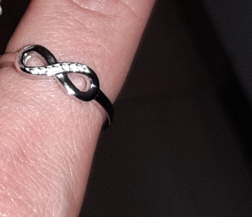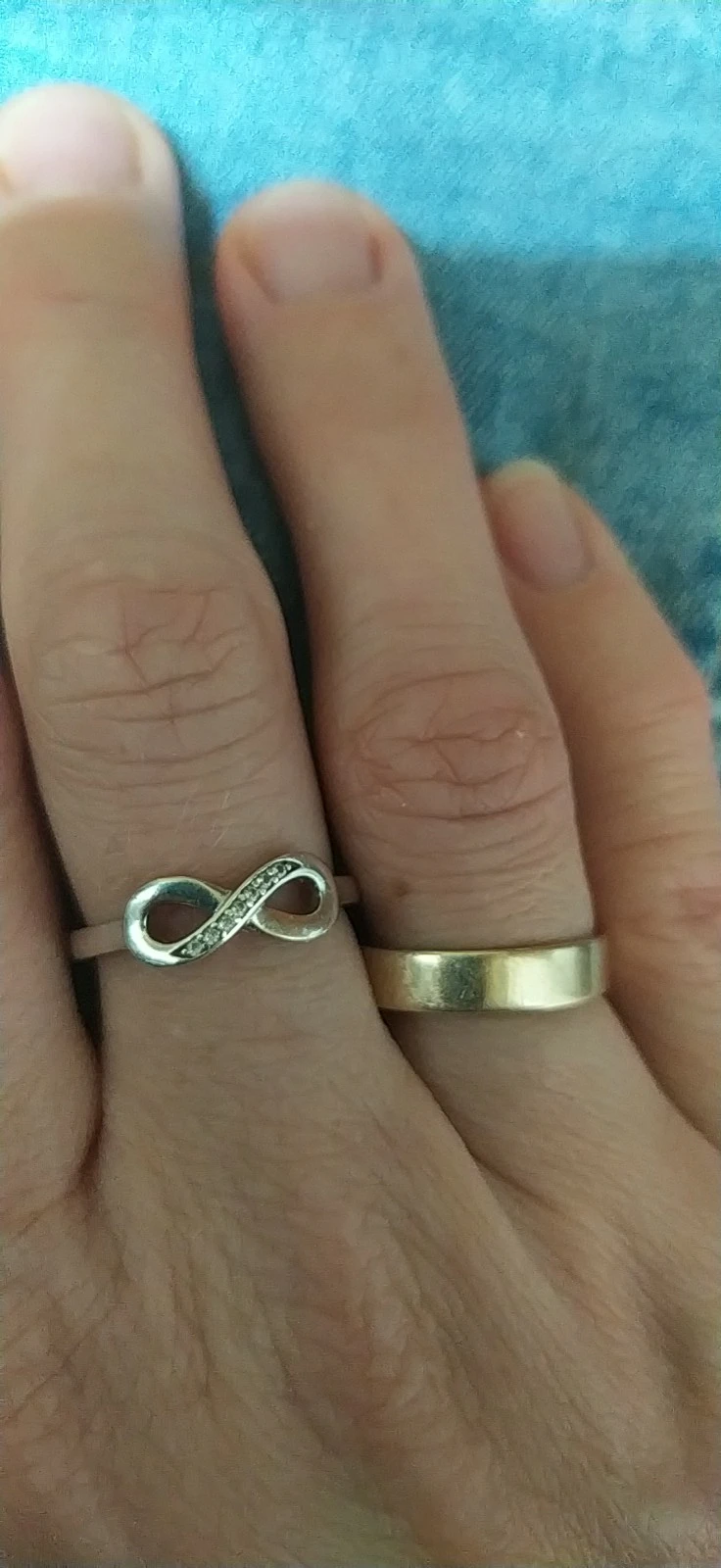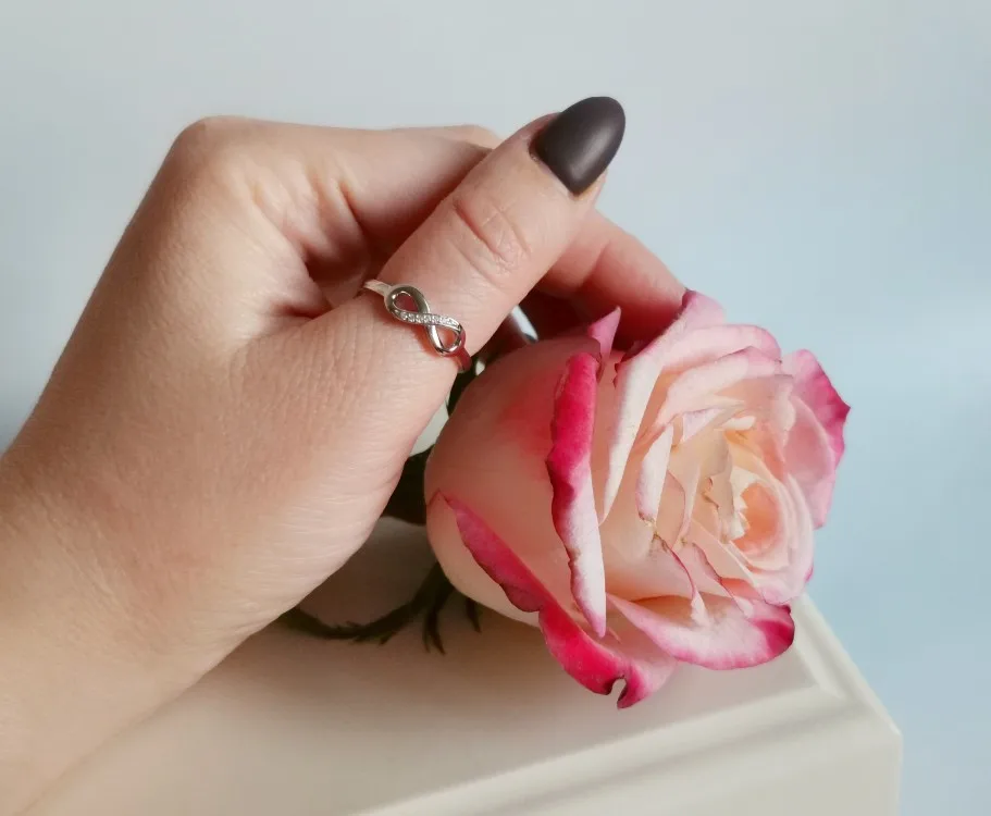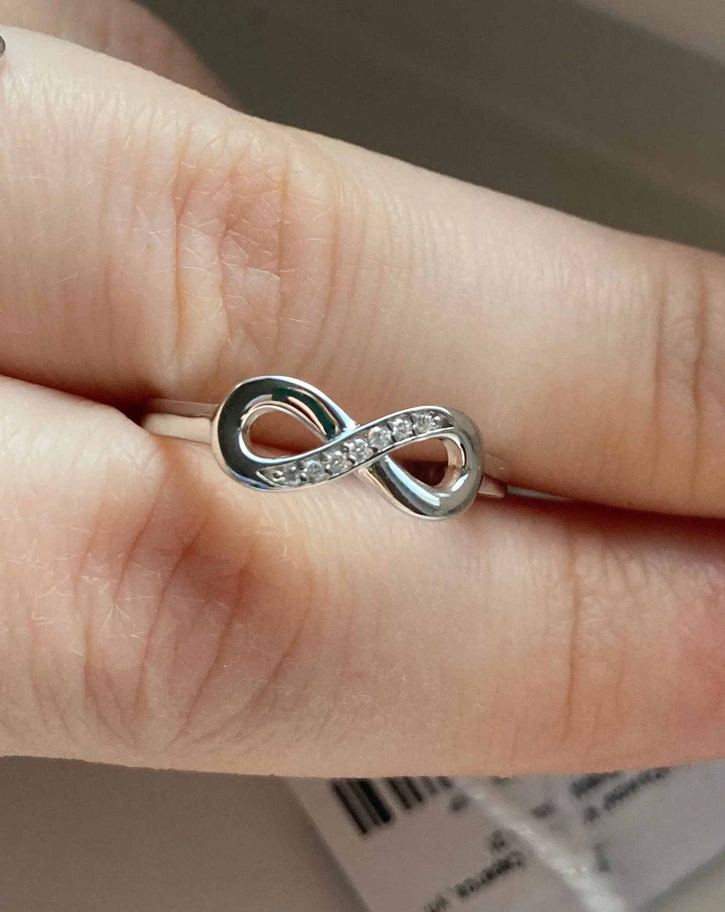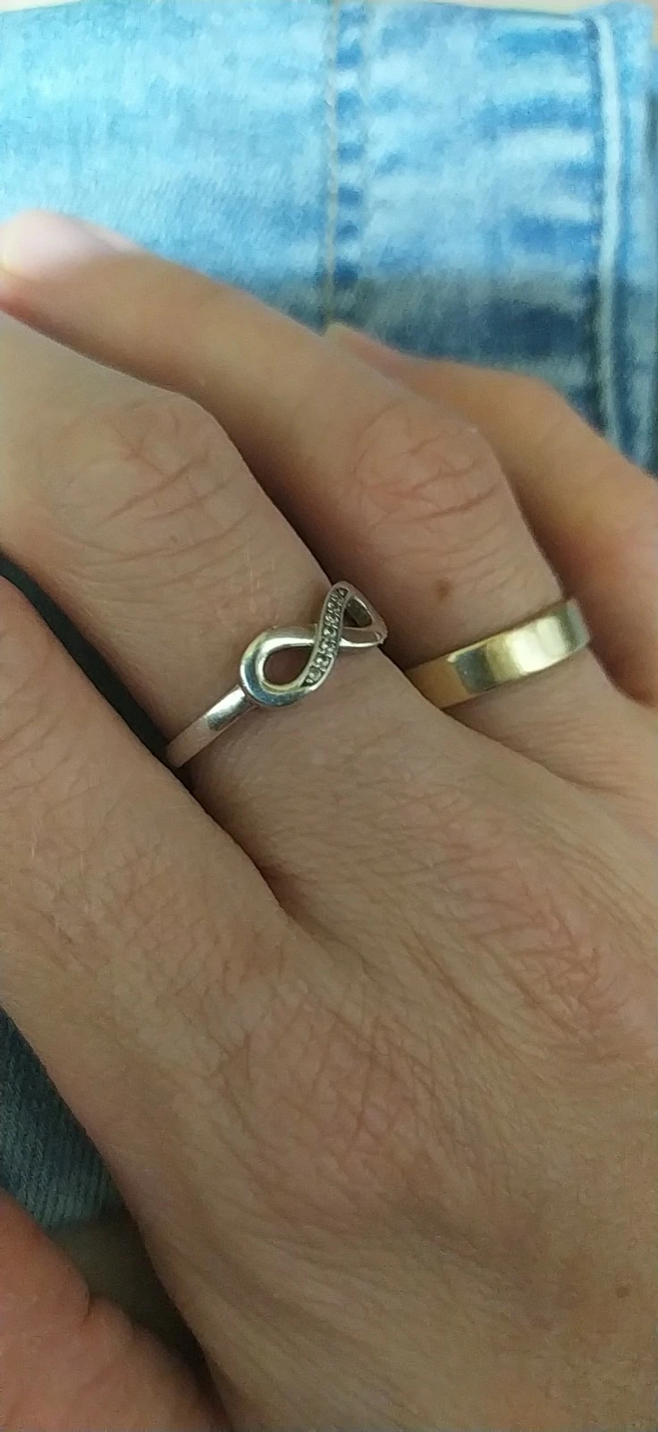 Милое колечко из серебра с символом бесконечности. Кольцо пришло упакованным в индивидуальный пакет, была листовка бренда. Кольцо доступно в четырех размерах – 6, 7, 8 и 9. Я выбрала для себя размер 7. Подходит на размер 17. Колечко выполнено из стерлингового серебра 925 пробы. Значок пробы стоит. Выглядит оно очень красиво, символика бесконечности мне близка, поэтому колечко мне очень понравилось, люблю этот символ. Оно не крупное, легкое, выполнено качественно. С одной стороны украшено некрупными фианитами. Смотрится колечко очень мило и нежно, стоит недорого, рекомендую присмотреться.