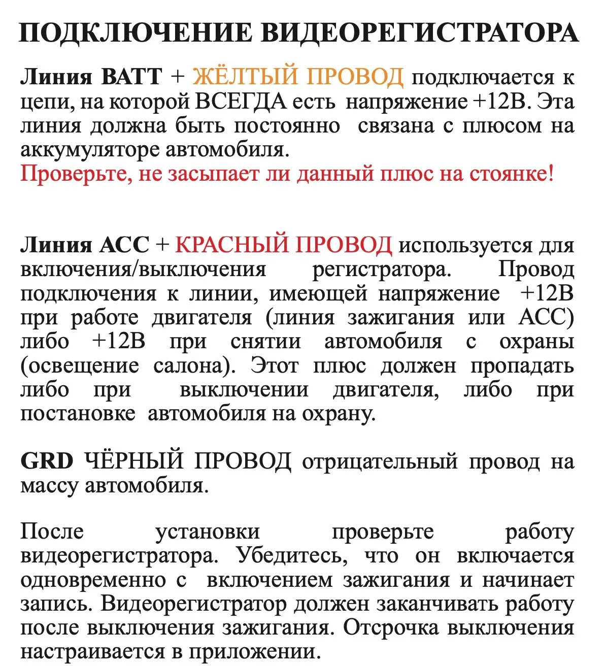 Постоянная мощность (батарея + 12 В): Подключите или отключите Автомобильный ключ, питание будет бесперебойным. Подключите