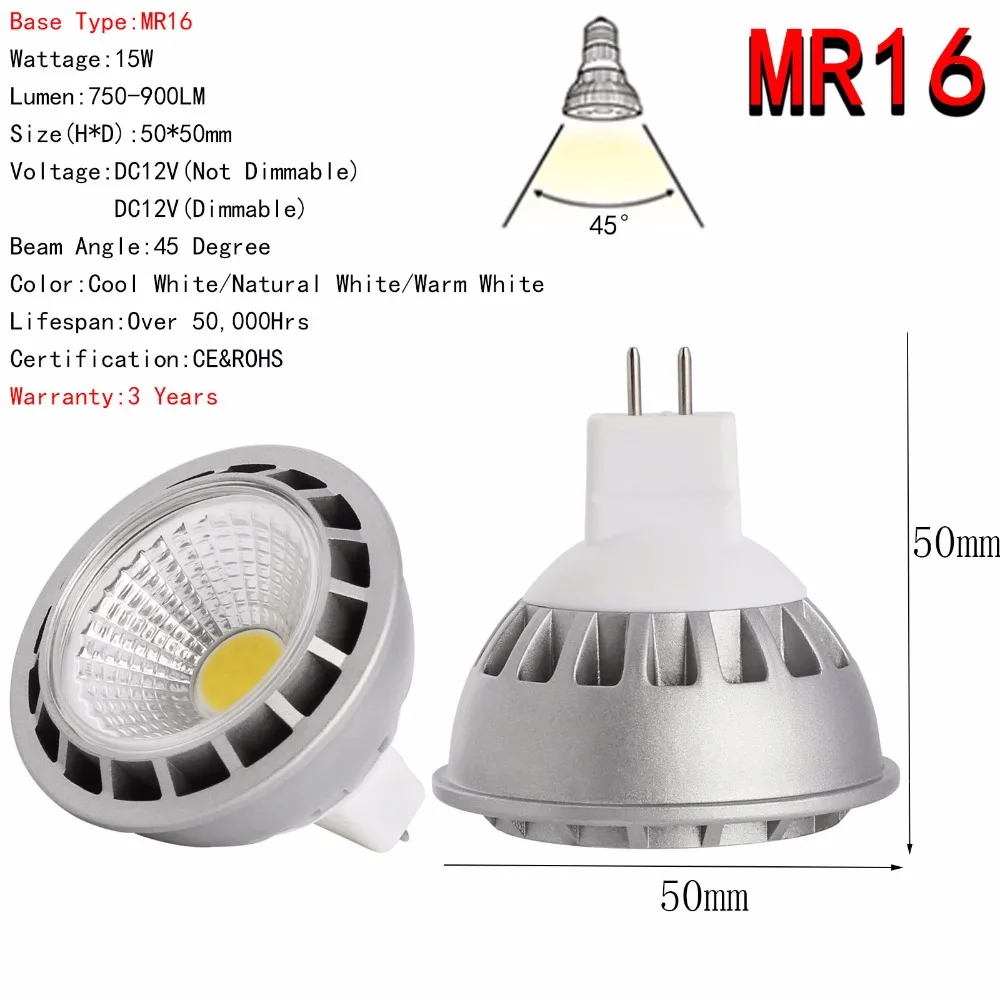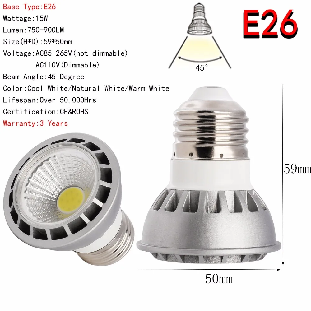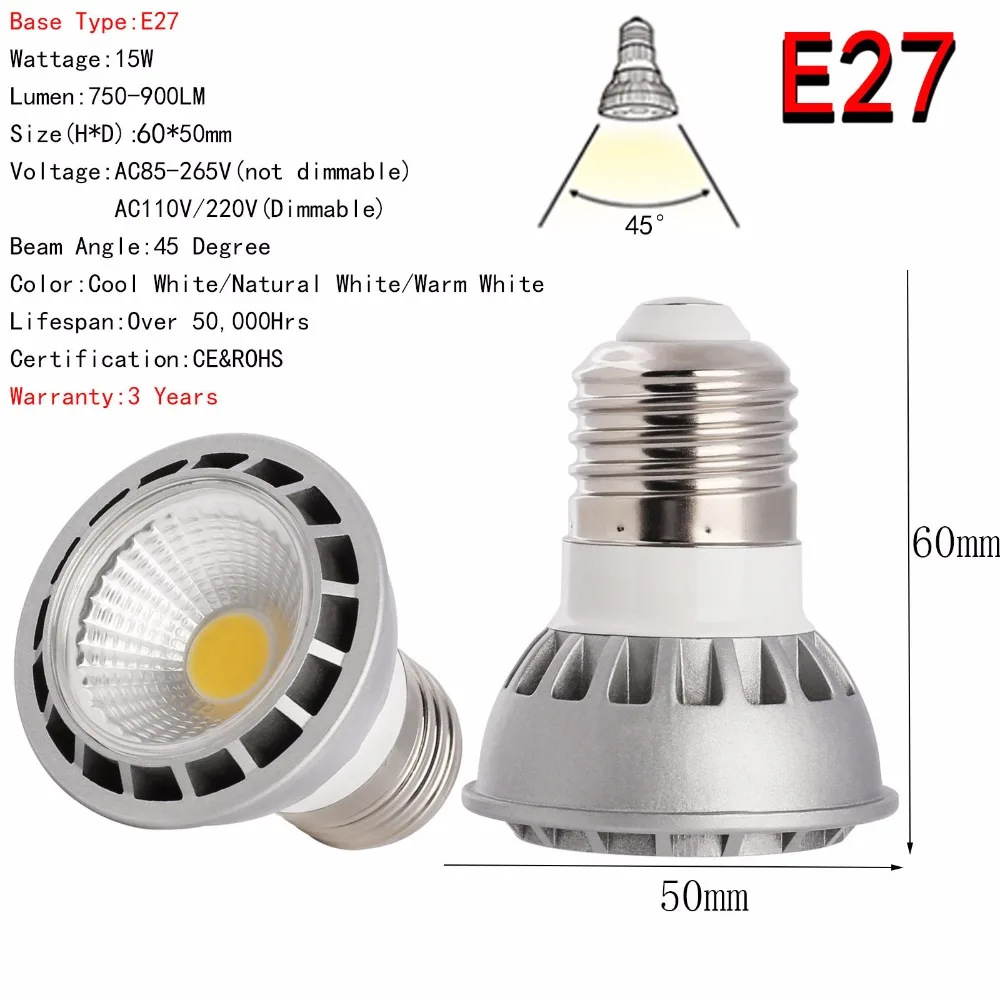 Ультраяркий Светодиодный прожектор с регулируемой яркостью E27E26GU10MR16, 15 Вт, лампочка COB, лампочки CREE