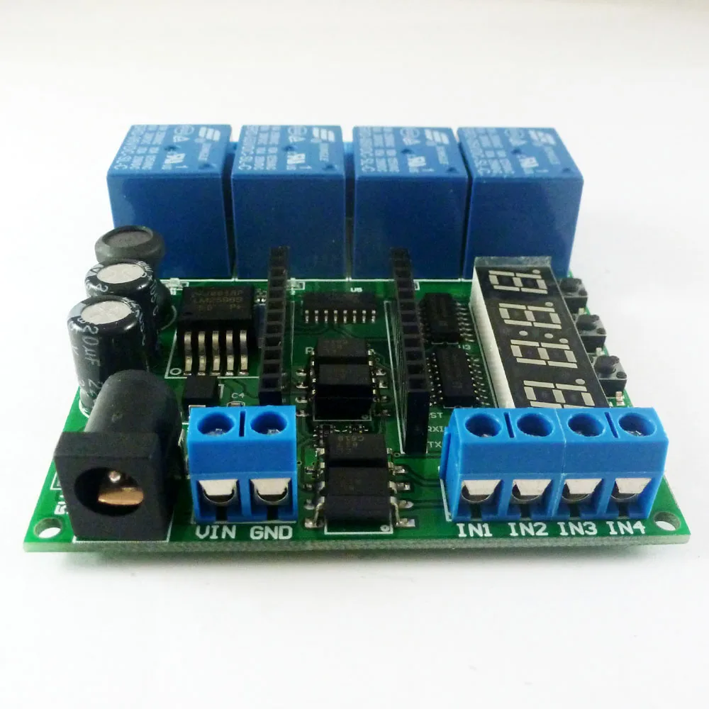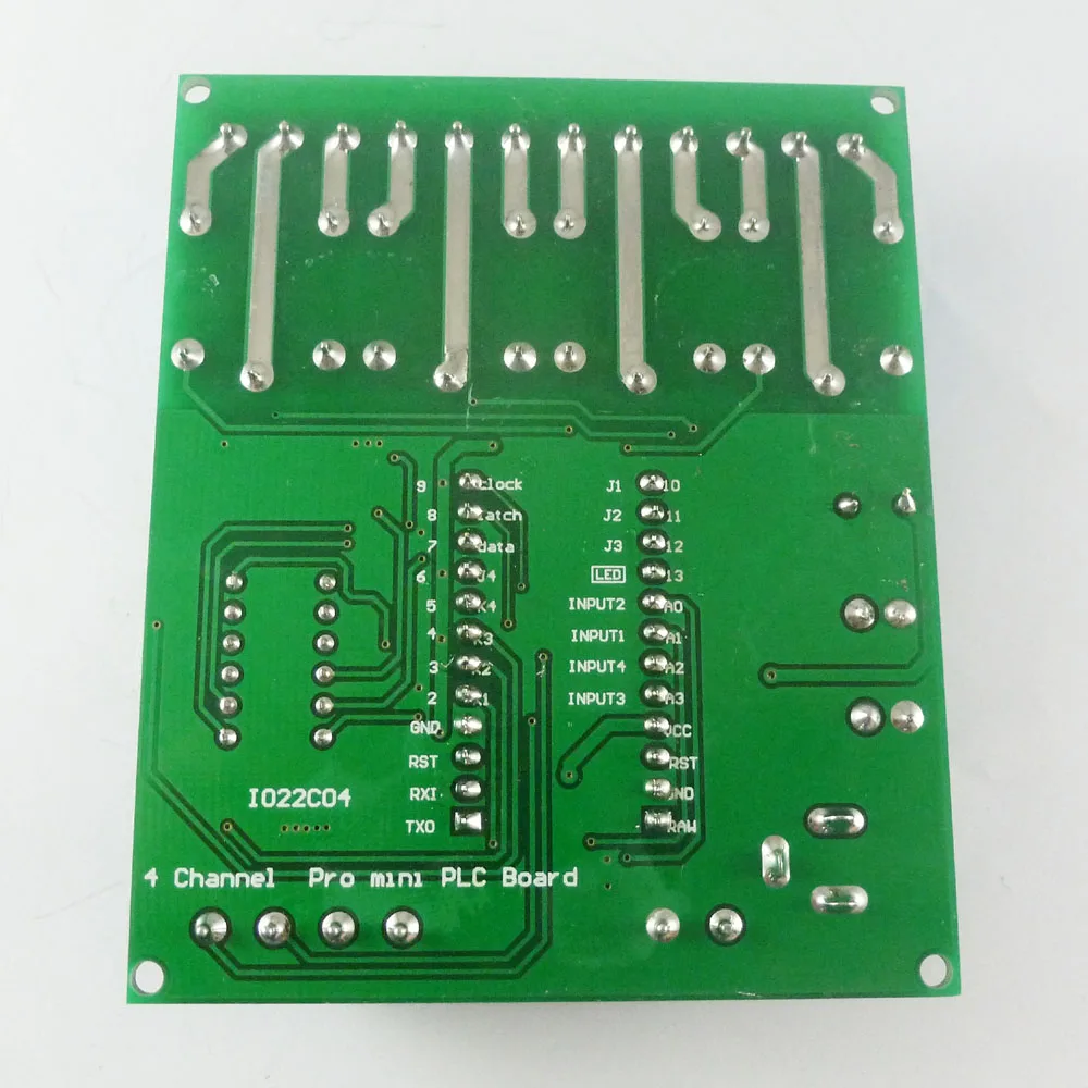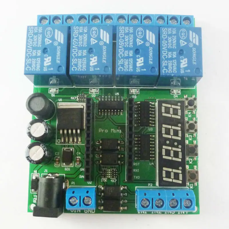 3. Бортовые ресурсы:4x оптоизолированные входы(Триггер низкого уровня, тип NPN), 4x кнопки,4-битный цифровой дисплей с трубкой-1 шт., 1 пара мини-слотов Pro,4 релейных выхода