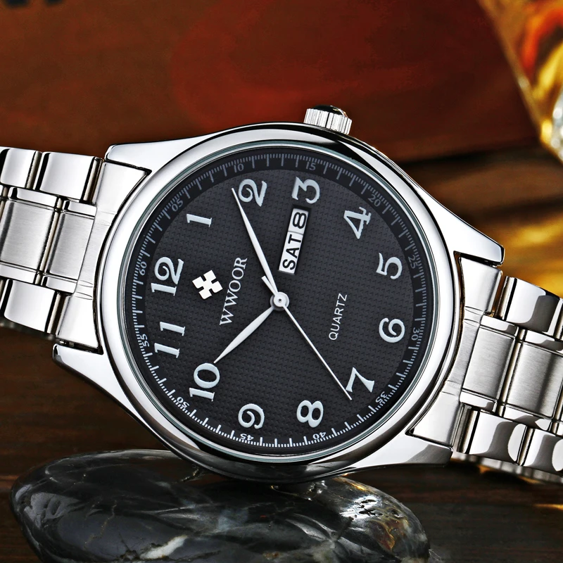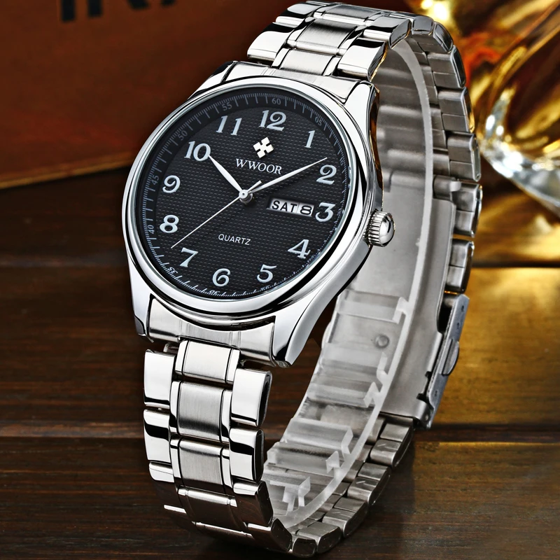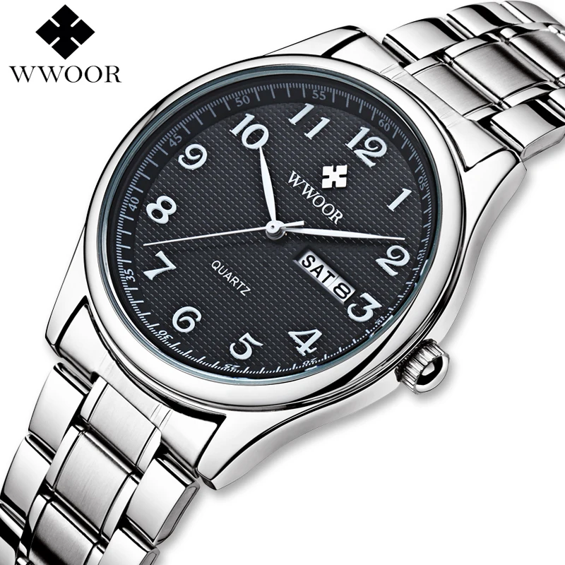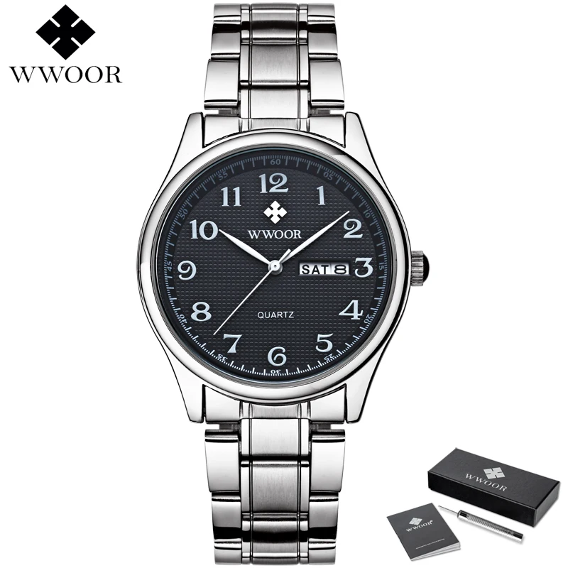 Часы наручные WWOOR Мужские кварцевые, брендовые Роскошные Аналоговые водонепроницаемые из нержавеющей стали, с датой на день, в деловом стиле, серебристые
