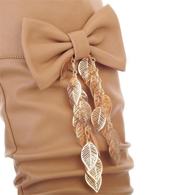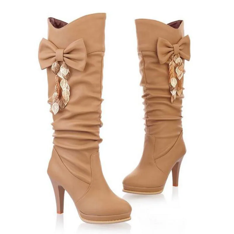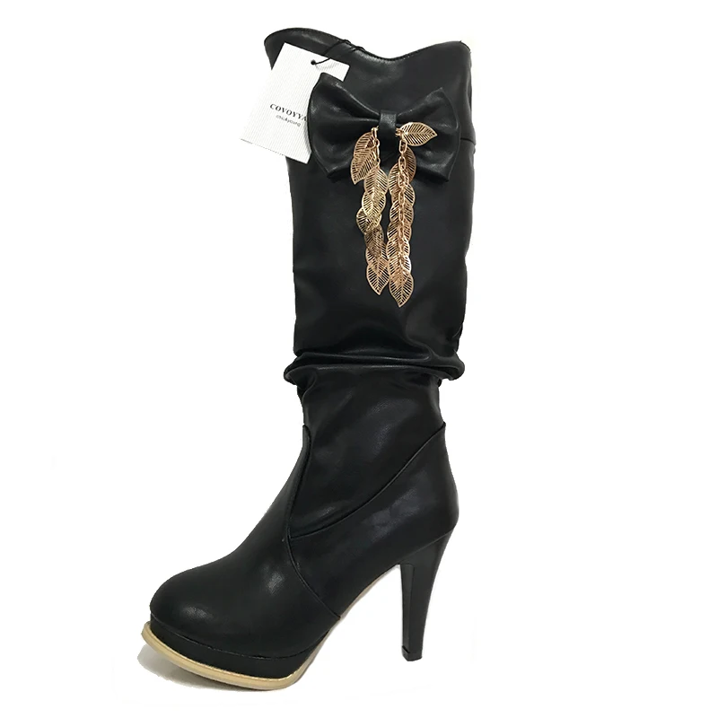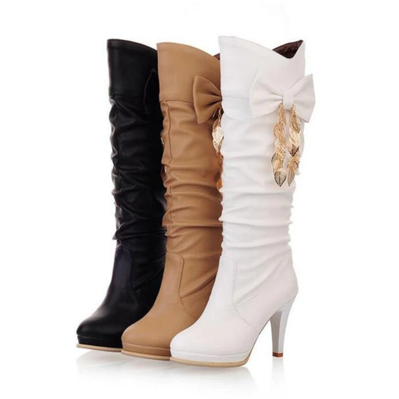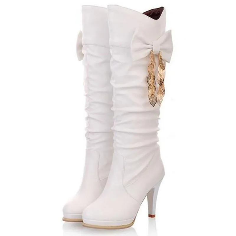 COVOYYAR2021; Элегантные женские сапоги с бантом; Зимние сапоги белого цвета на высоком каблуке-шпильке с декором в виде листьев; Женская обувь; Сезон осень-зима; WBS625