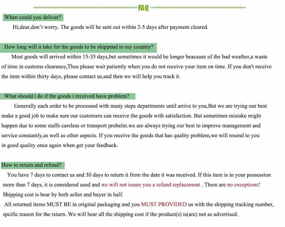 4. Иногда это может быть дольше из-за плохой погоды, траты времени на таможенное оформление. Поэтому наберитесь терпения если вы не получили товар вовремя. Если вы не получили товар в течение 30 дней, пожалуйста, свяжитесь с нами, и мы поможем вам отследить его.
