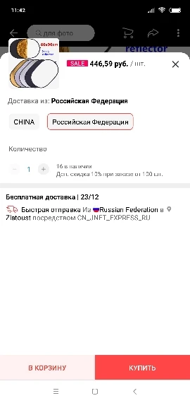 Отличный товар и супер быстрая доставка-8 дней!если честно сомневалась в выборе начитавшись отзывов, но рискнула и не пожалела! Купила по акции за 709,83 на 11.11, чему несказанно рада) Светоотражатель шикарного качества, в фотостудиях гораздо хуже в штатном оборудовании!!! Большая благодарность продавцу!!!-общаться не довелось*