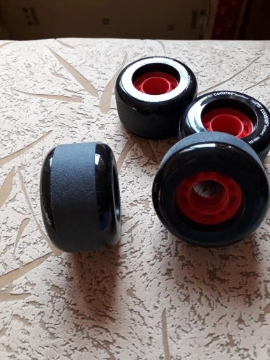 Посылка доехала за три недели. В целом колёса хорошие, но качество чуть подкачало. на фото виден брак печати сверху-слева и брак литья снизу-справа. Присмотритесь, на торце видны заусенцы. В целом плевать, это колёса. Обратите внимание, у меня в комплекте пришло по две пары колёс одинаковых параметров, но разных размеров пятен контакта. Хз, указанно ли это в спецификации или у меня пары разных партий.