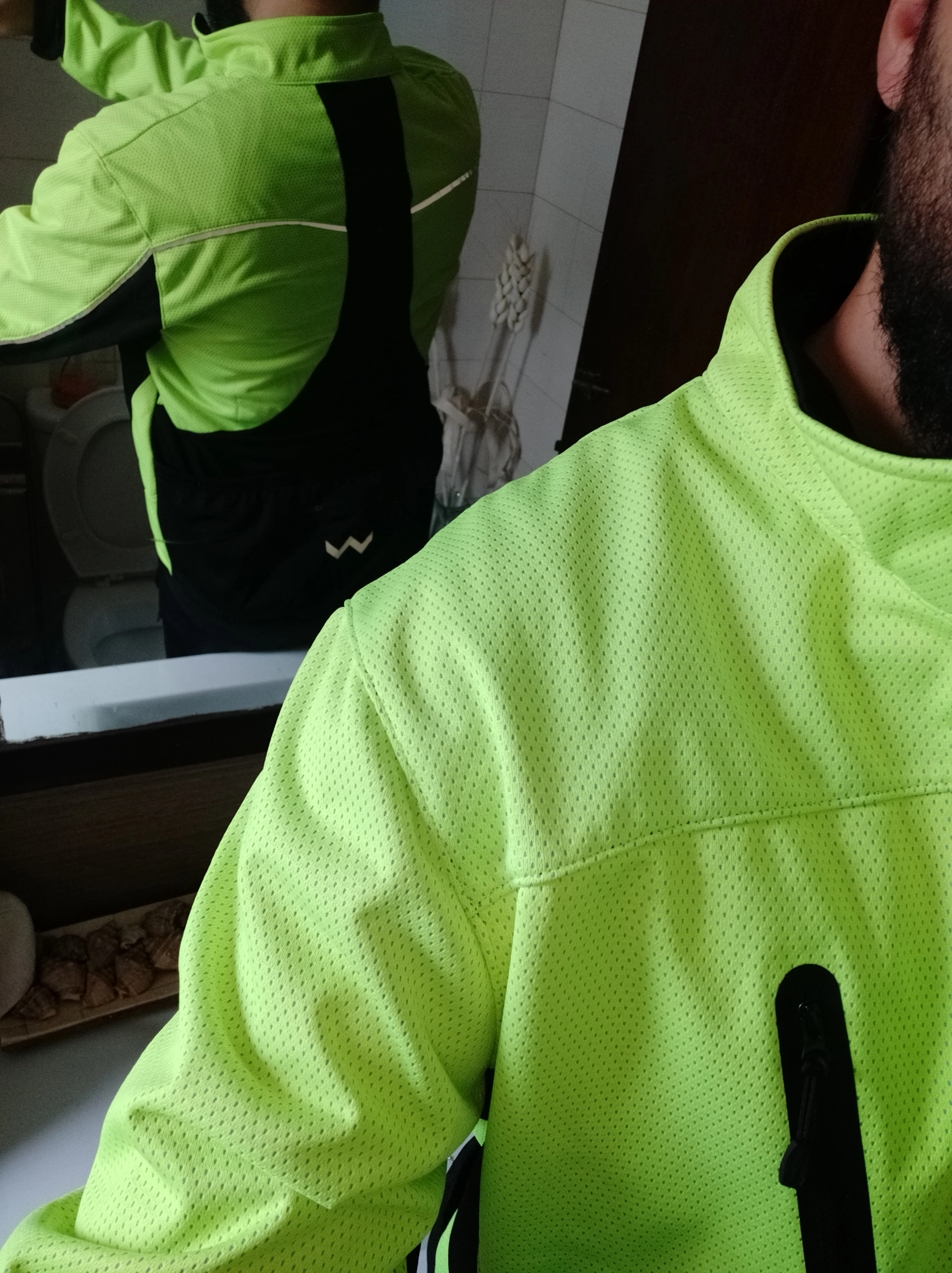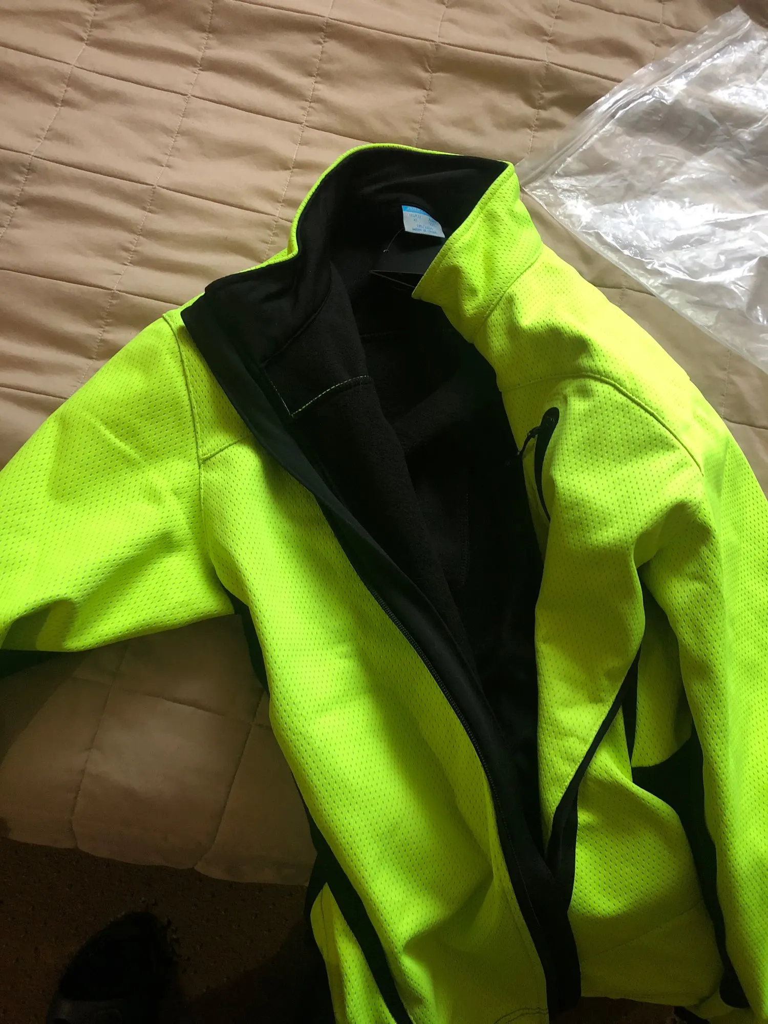 В Україну замовлення приїхало на 25-й день з моменту оплати. Візуально все добре, якість пошиття гарна. Матеріал яскравого кольору щільний, вітер пропускати не буде, а зсередини на ньому щось схоже до тоненького флісу, а чорний матеріал зверху гладенький, а всередині як флісовий, але не дуже товстий, повітря пропускатиме. На зріст 174 см і вагу 72 кг розмір підійшов нормально.