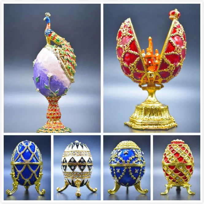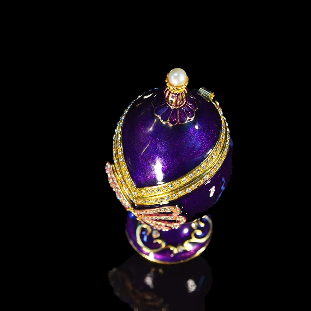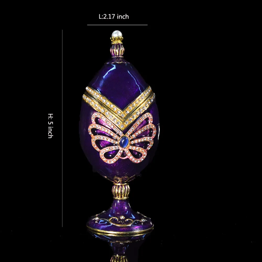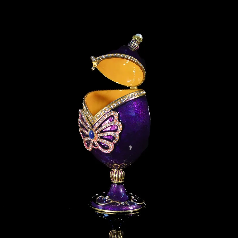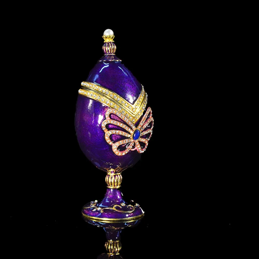 Дизайна продукта:Дизайн этого продукта вдохновлен Российской Фаберже яйцо. Яйцо адаптировано с новым материалом под названием цинковый сплав, чтобы сделать его твердым и чистым, покрытым глазурью пурпули. Самое большое яркое пятно-передняя часть яйца выгравирована бабочкой, покрытой блестящими бриллиантами. Выглядит очень красиво. Хороший выбор для украшения дома, коробки для ювелирных изделий.