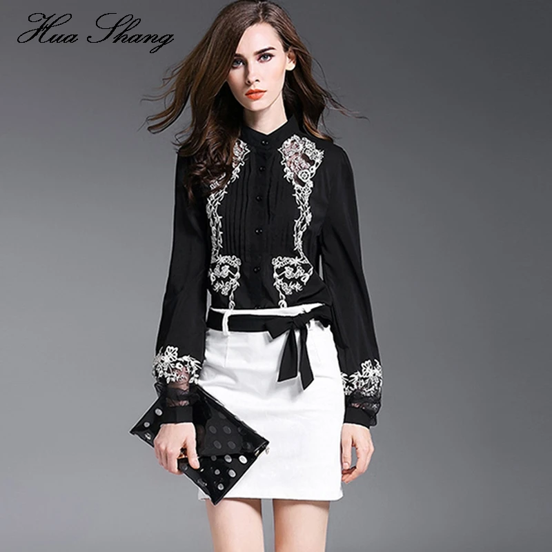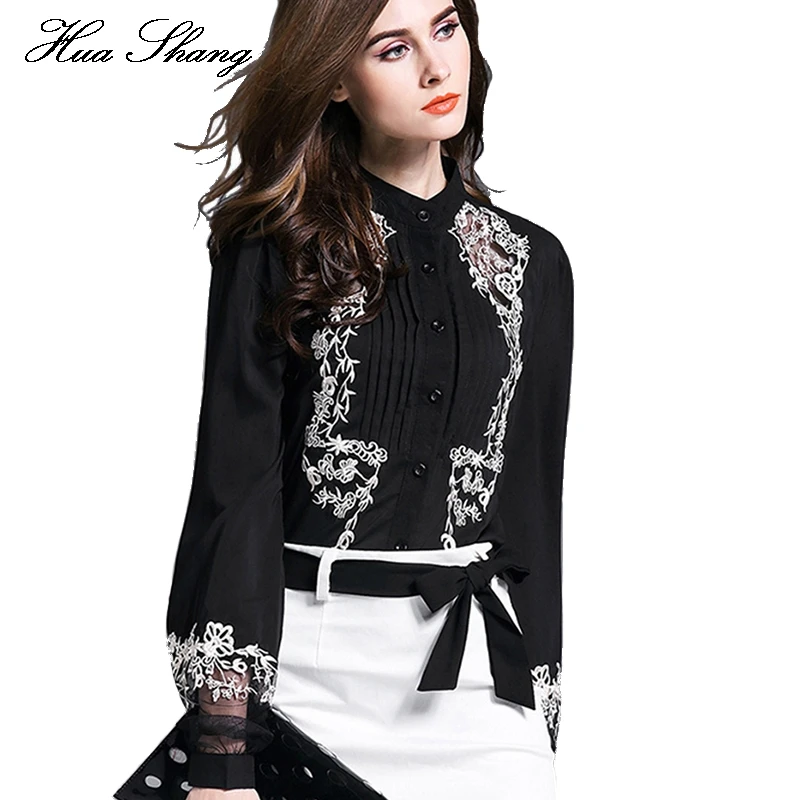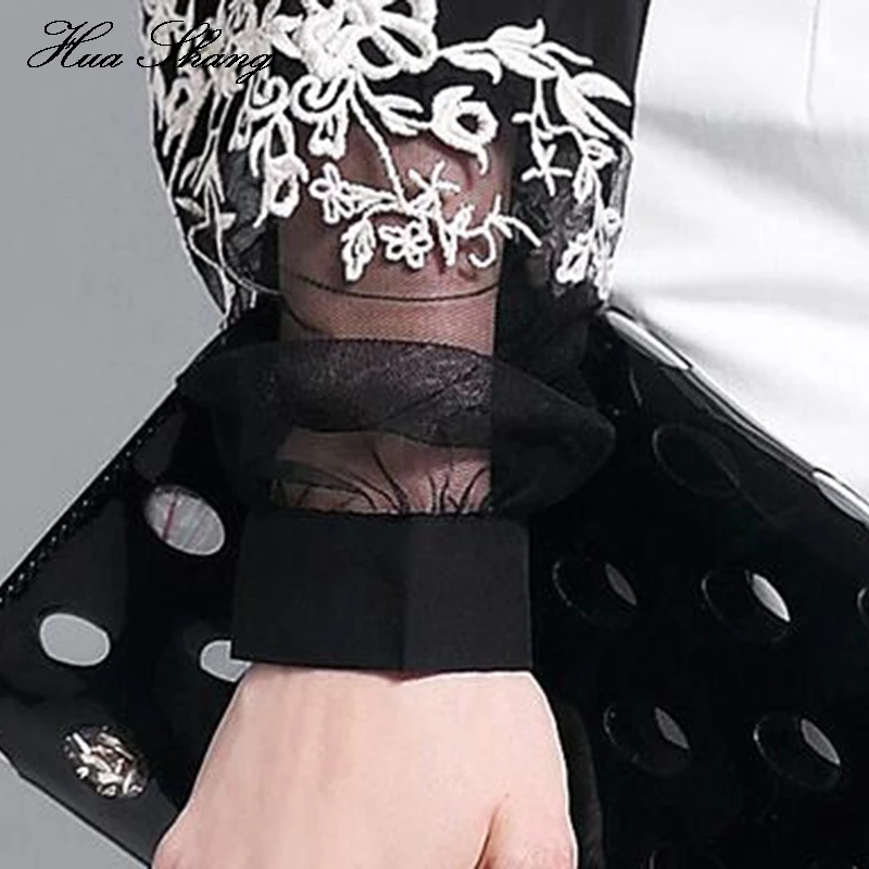 Новые модные женские топы с вышивкой, прозрачные цветочные рукава-фонарики, черная блузка, Женская рабочая одежда, Офисная шифоновая блузка