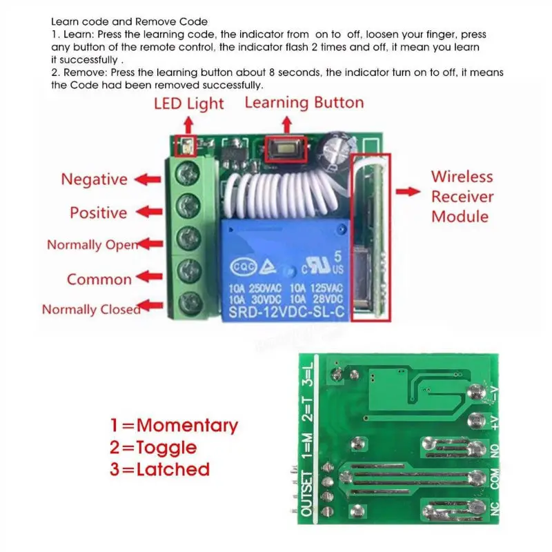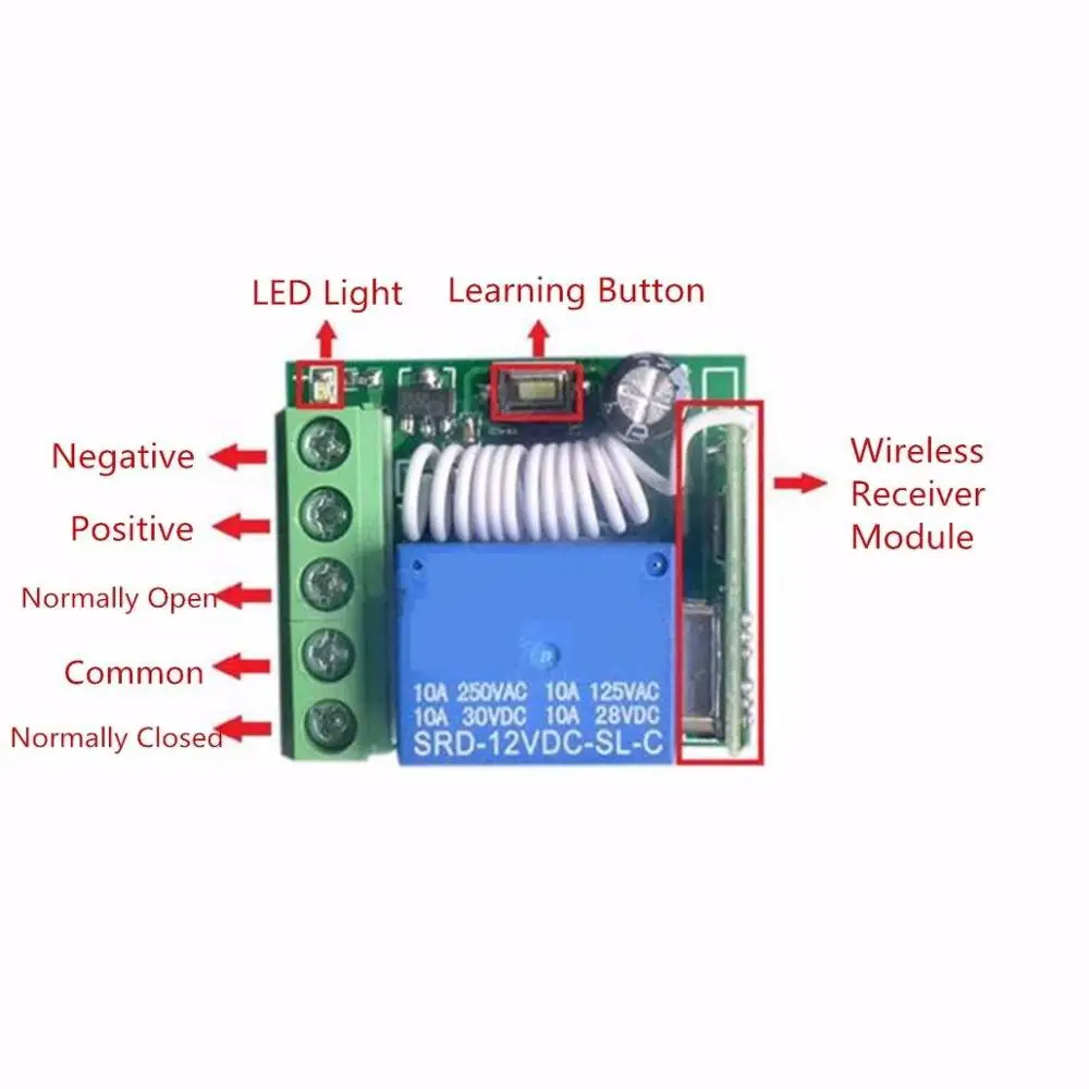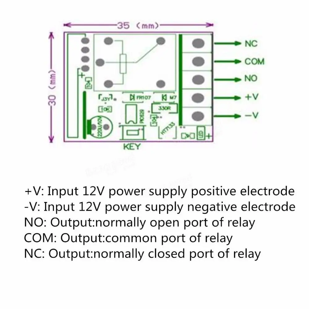 Спецификация:1. Входное напряжение: DC10-14V2. Ток в режиме ожидания: <5 мА3. Частота RF: 433 МГц4. Радиочастотный режим работы: супер гетеродинный приемник5. Чувствительность приемника: >90 дБм6. Расстояние дистанционного управления: >100 метров (в открытой среде)7. Способ декодирования: программное декодирование MCU8. Может хранить количество пультов дистанционного управления: 509. Поддержка типа пульта дистанционного управления: фиксированный код, обучающий код10. Канал: 1CH11. Несколько режимов работы: (бег/без защелки, межблокировка/фиксация, самоблокировка/самофиксация, задержка выключения)12. Способ подключения: фиксированная клемма13. Рабочее напряжение: 12 В постоянного тока14. Выходной ток: 10А15. Номинальная нагрузка: 10 А В/10 А В переменного тока10A 30VDC / 10A 28VDC16. Выход: нормально открытый, обычный, нормально закрытый17. Размеры: 3,5 см * 3 см * 1,6 смСпособ работы/вывода:1. Бег/без фиксации: Нажмите одну кнопку работает/вкл. Ослабьте палец на той же кнопке-это стоп/выкл. Для одноканального переключателя требуется одна кнопка дистанционного управления.2. Самоблокировка/самофиксация: Нажмите одну кнопку, чтобы включить/включить один раз. Нажмите ту же кнопку снова, чтобы остановить/выключить. Для одноканального переключателя требуется одна кнопка дистанционного управления.3. Блокировка/Фиксация: Нажатие одной кнопки работает/вкл., нажатие другой кнопки-стоп/выкл. Для одноканального переключателя требуется 2 кнопки дистанционного управления.4. Задержка: Нажмите натяжение реле дистанционного управления, отпустите пульт дистанционного управления и начните хронометраж. Через 5s,10s,15s реле автоматически закроетсяОписание:1. Нажмите код обучения. Индикатор мигает, ослабьте палец, нажмите любую кнопку на пульте дистанционного управленияИндикатор мигнет 2 раза и выключен. Это значит, что вы научились этому успешно.2. Может изучать более 12 чипов 2262 или 1527 с беспроводным пультом дистанционного управления с разными кодами 433 МГц3. Удалить/Очистить: Нажмите кнопку обучения около 8 секунд, индикатор включится в выключение, это означает, что сохраняемая Вами информация была успешно удалена.Посылка1x12V 1CH 433MHz беспроводной релейный Переключатель приемника с чехлом