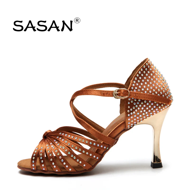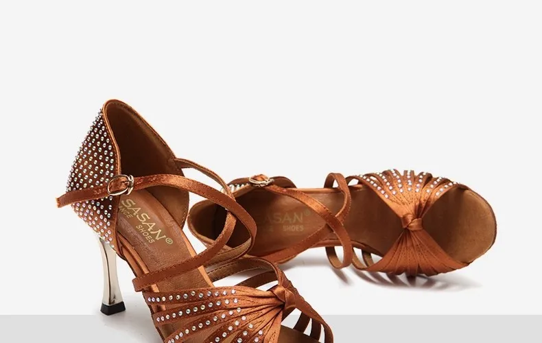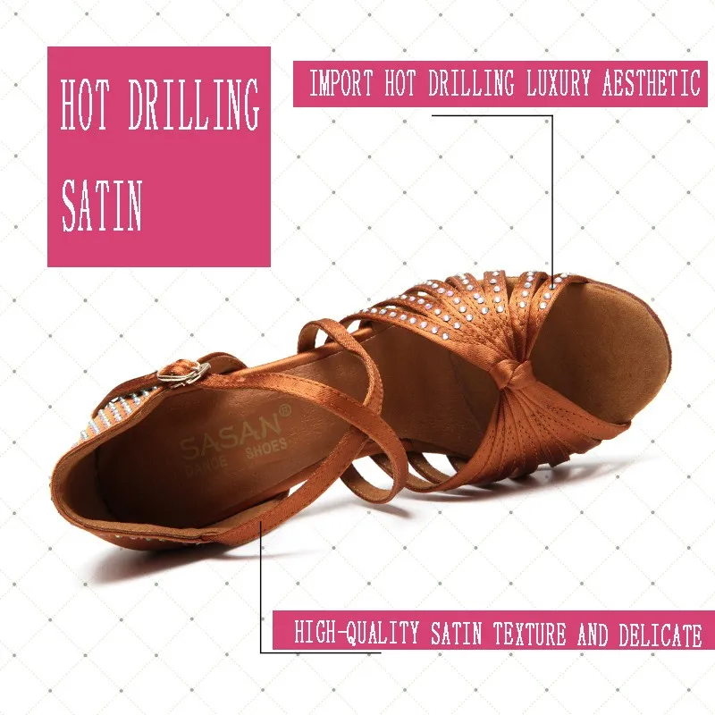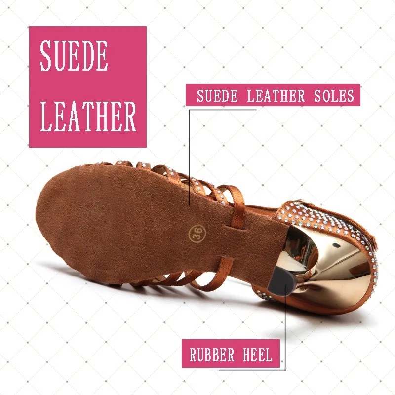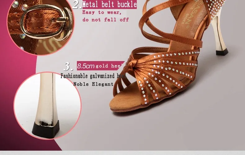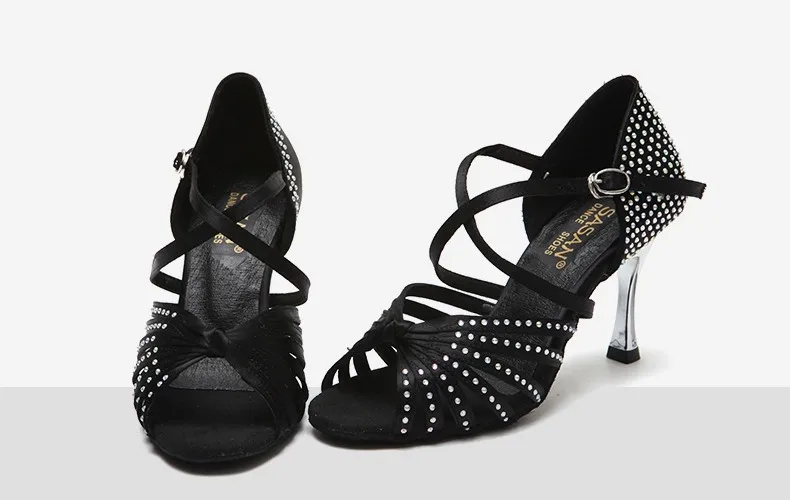Спортивная обувь для бальных танцев, обувь для латиноамериканских танцев для женщин и девушек, с мягкой подошвой, со стразами, искусственный атлас, 8,5 см, золотистый каблук, черный