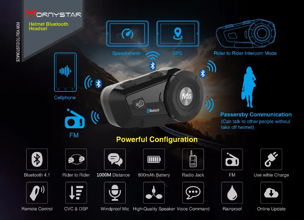 Гарнитура для мотоциклетного шлема M6 Plus, беспроводное переговорное устройство с FM-радио для мотоциклистов, Водонепроницаемая Bluetooth-гарнитура для шлема