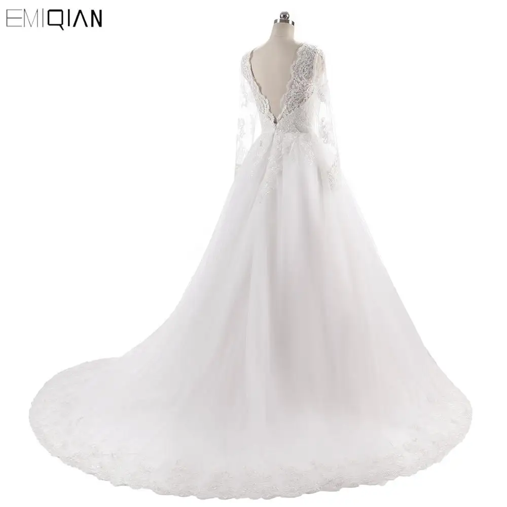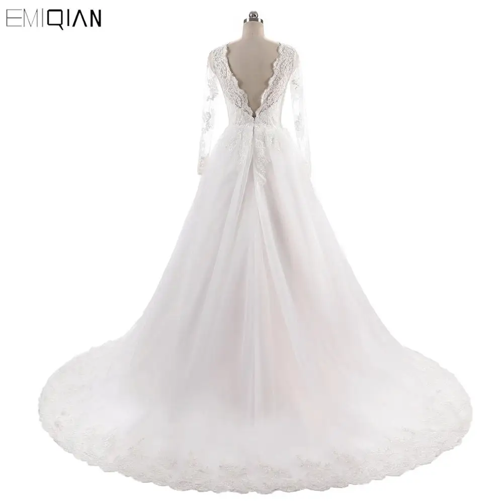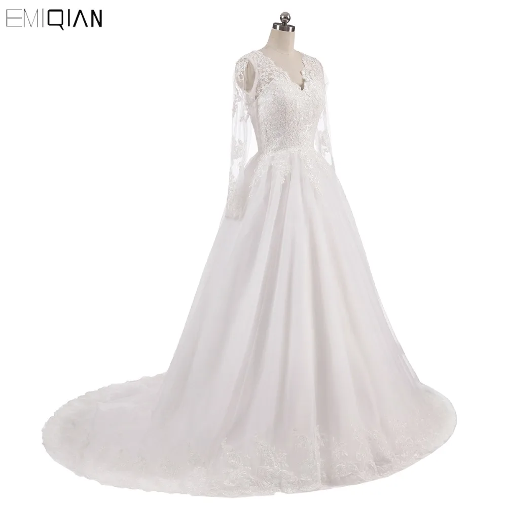 Винтажное свадебное платье с V-образным вырезом, кружевной аппликацией и длинными рукавами