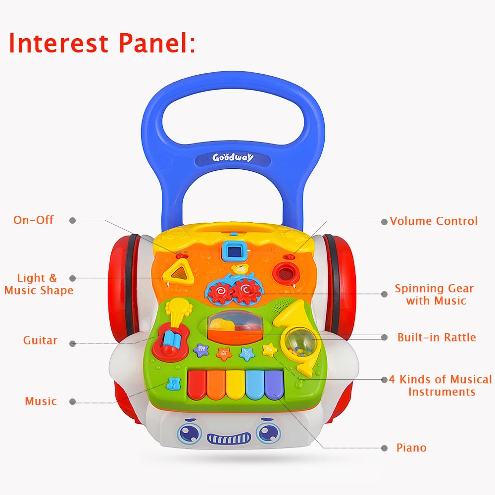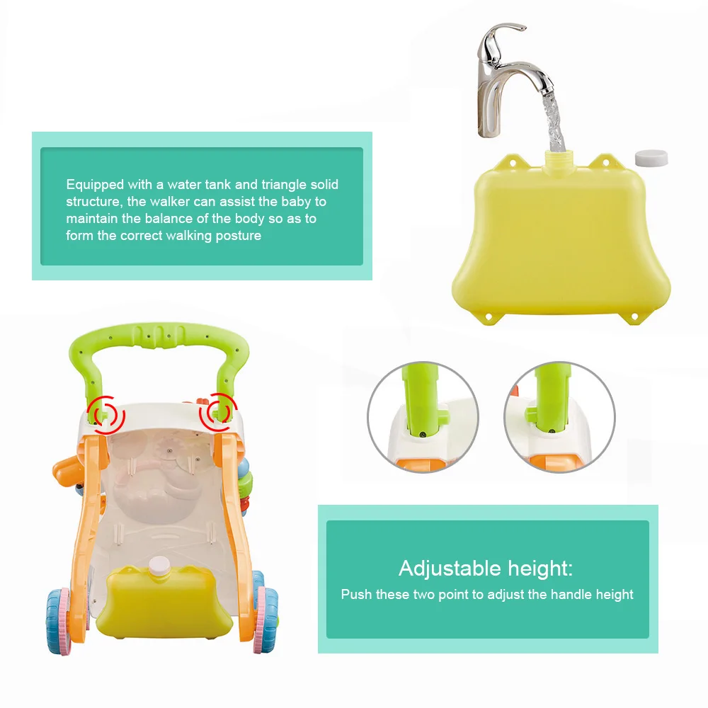Этот ходунок способен тренировать слух вашего ребенка, чувство прикосновения, познание ребенка разных форм и научиться ходить научно.Ходунки предлагают два способа игры: надавите на него по полу + Сядьте и играйте.Регулируемая скорость. Отрегулируйте четыре колеса для изменения скорости движения. Три уровня.Треугольная прочная конструкция и оснащенная резервуаром для воды на спине, ходунки могут помочь ребенку поддерживать баланс тела, чтобы сформировать правильную позу при ходьбе.Очеловеченный дизайн. Специально изготовленное резиновое заднее колесо, сильно увеличивается трение, не скользит. Улучшенная конструкция закрытого колеса, не повредит вашим маленьким детям.Регулируемая высота. Нажимайте кнопки на двух сторонах ручки, чтобы они подходили малышам разного роста.Высокое качество и безопасность. На руке имеется Нескользящая Текстура, ваш ребенок не упадет при схватке. Музыкальные ходунки изготовлены из импортного АБС-материала, нетоксичные и экологически чистые.Характеристики:Материал: АБСПол: унисексВозраст: 9 месяцев +Размер изделия: 44*42*32 см/17,3*16,5 * дюймаПосылка лке:Посылка: 45*33,9*10,8 см/18,0*13,3 * дюймаВес посылка: 1650 гПосылка тация:1 тележка для малышей