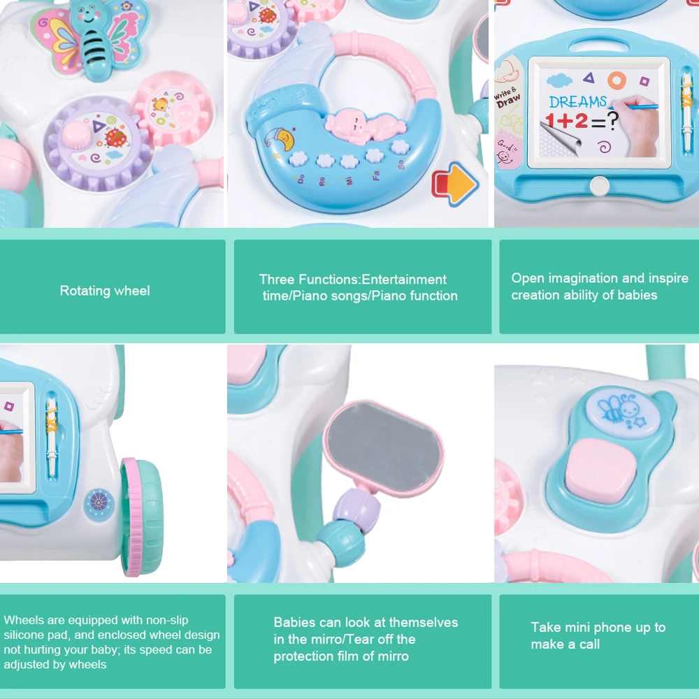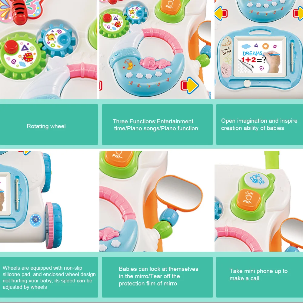 Обучающие ходунки «сидеть-сидеть» помогают вашему ребенку развиваться от гусеничного хода к ходунку благодаря адаптивной технологии. Благодаря двору игривых друзей ваш малыш получит бесконечное удовольствие, когда научится ходить. Начните с легко снимаемой панели активности для напольных игр или развлечений на ходу, а затем Увеличьте его с помощью ходунка для веселья и маневра. Доска для рисования, электронный орган, небольшая книжка, телефонная трубка предлагает бесконечное удовольствие, которое будет стимулировать обучение вашего ребенка и развивать его моторику.Особенности:Этот ходунок способен тренировать слух вашего ребенка, чувство прикосновения, познание ребенка разных форм и научиться ходить научно.Ходунки предлагают два способа игры: надавите на него по полу + Сядьте и играйте.Регулируемый винт позволяет регулировать его скорость в соответствии с темпом обучения ребенка ходить, так что ребенок может научиться ходить более безопасным и научным способом.Треугольная прочная конструкция, ходунки могут помочь ребенку поддерживать баланс тела, чтобы сформировать правильную позу при ходьбе.Специально изготовленное резиновое заднее колесо, сильно увеличивается трение, не скользит.На руке имеется Нескользящая Текстура, ваш ребенок не упадет при схватке.Музыкальные ходунки изготовлены из импортного АБС-материала, нетоксичные и экологически чистые.Характеристики:Материал: АБСПол: унисексВозраст: 9 месяцев +Размер изделия: 31*41,5*45 смПосылка: 41*30*8,5 см/16,1*11,8*3,3 дюймаВес посылка: 1380 г/3 фунтаПосылка тация:1 тележка для малышейПримечание: Цвет колес и мелких деталей будет случайным.