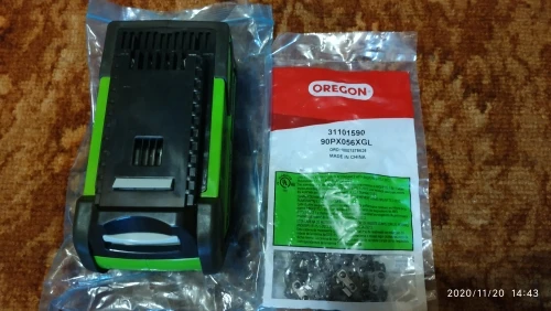 Доставка IML из РФ в Москву на 3 ий день.Коробка грязная ,рваная и переклеенная.На удивление все в хорошем состоянии.Мотор как то трещит, как будто нет смазки, не знаю,разобрать или притрется...Мощность ЗУ 90 Вт.Пила несколько тяжеловата по ощущениям и не очень хорошо сбалансирована.Батарея тяжелая.Шина идет OREGON , как собственно и цепь.Должна быть 1,1 мм но кладут и 1,5 .Оставляю фото с которой пилит практически с такой же скоростью как и бензиновый SHTIHL. Что бы не бегали не искали какая цепь и шина!Смотри на фото.