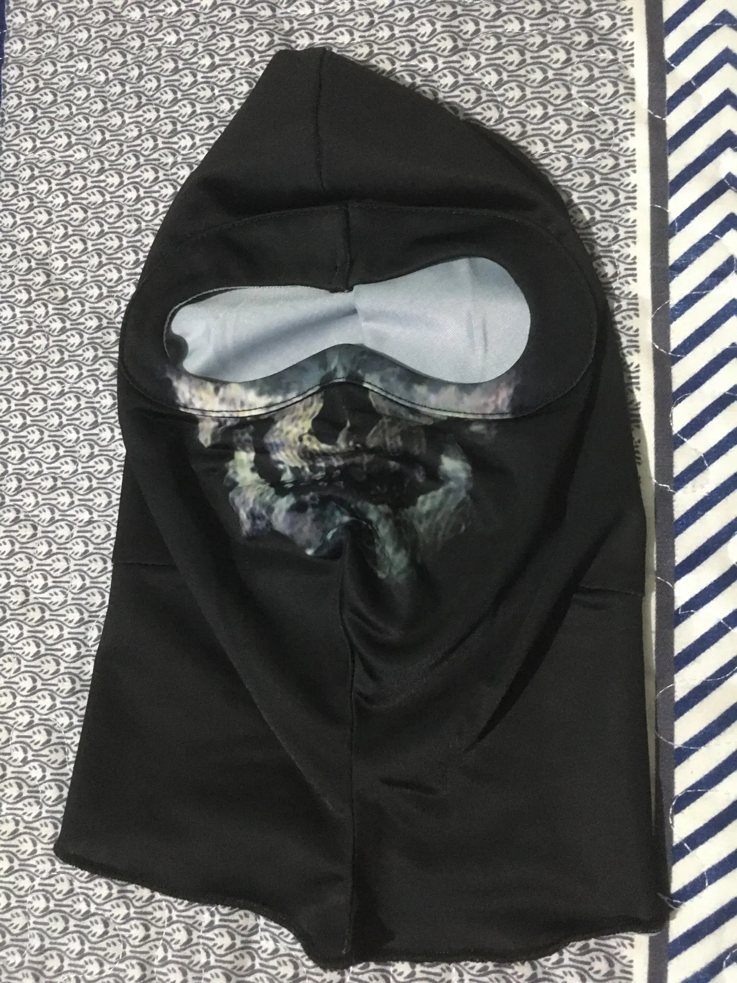 Очень хорошая маска; Дизайн хорошо выполненной формы хорошо прилегает к лицу, голове и шее; Очень хорошая печать выглядит очень прочной, если бы печать была шире, это было бы впечатляюще; Я хотел бы версию 2,0 с самым большим широким принтом, это будет первым, чтобы купить его, Всего и абсолютно рекомендуется.