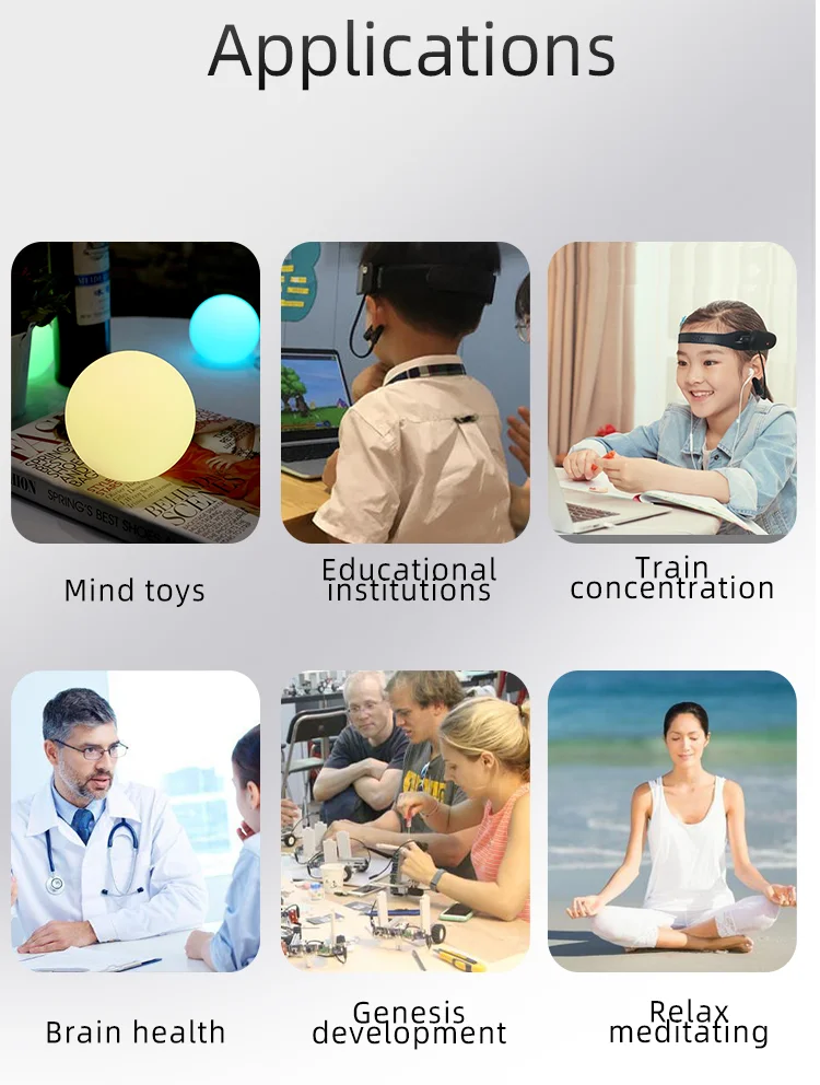 1. Тренировка фокусаУстройство используется для тренировки фокуса, играя в игры.Вы можете скачать Обучающие приложения из app store. Это не только помогаетВы фокусируете ум и УЛУЧШАЕТЕ работу мозга, но также весело играетеС друзьями и семьей, так что вы можете улучшить свой фокус вместе.PS: Вы также можете запросить у нас программное обеспечение и другие приложения, когда вы его получите.2. Медитация и сброс давленияИсследования показывают, что глубокая медитация может изменить частоту мозговых волн илиАльфа-волны.Повязка на голову с Bluetooth 2,0 поможет вам визуализировать вашу мозговую волнуАктивность в режиме реального времени, чтобы вы могли отслеживать ваш прогресс посредника.