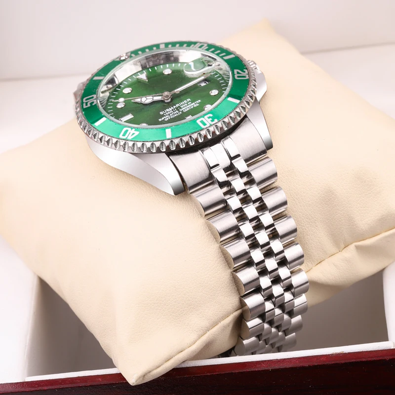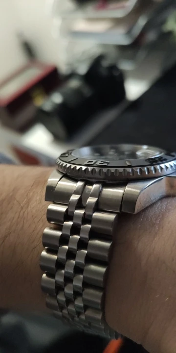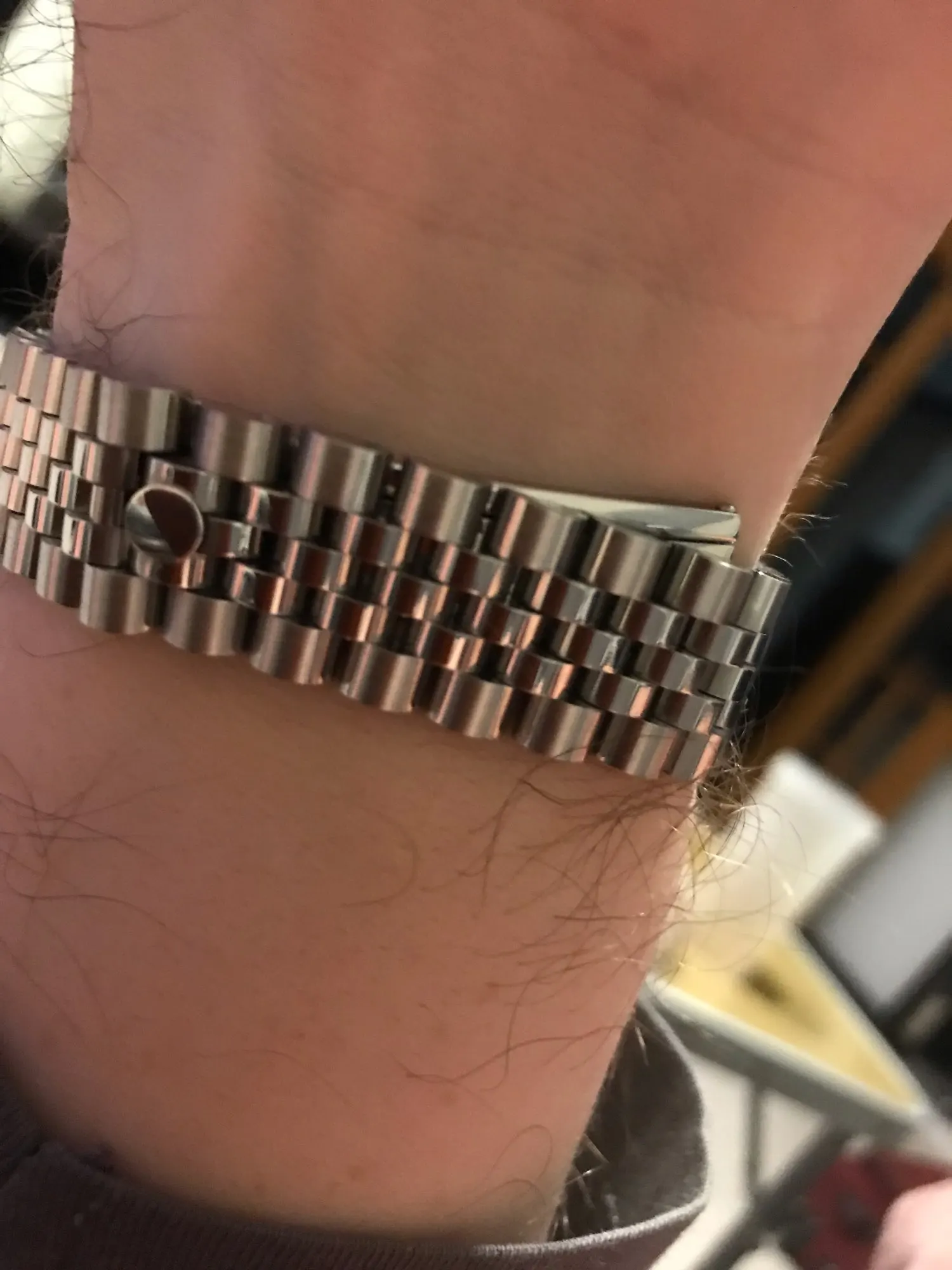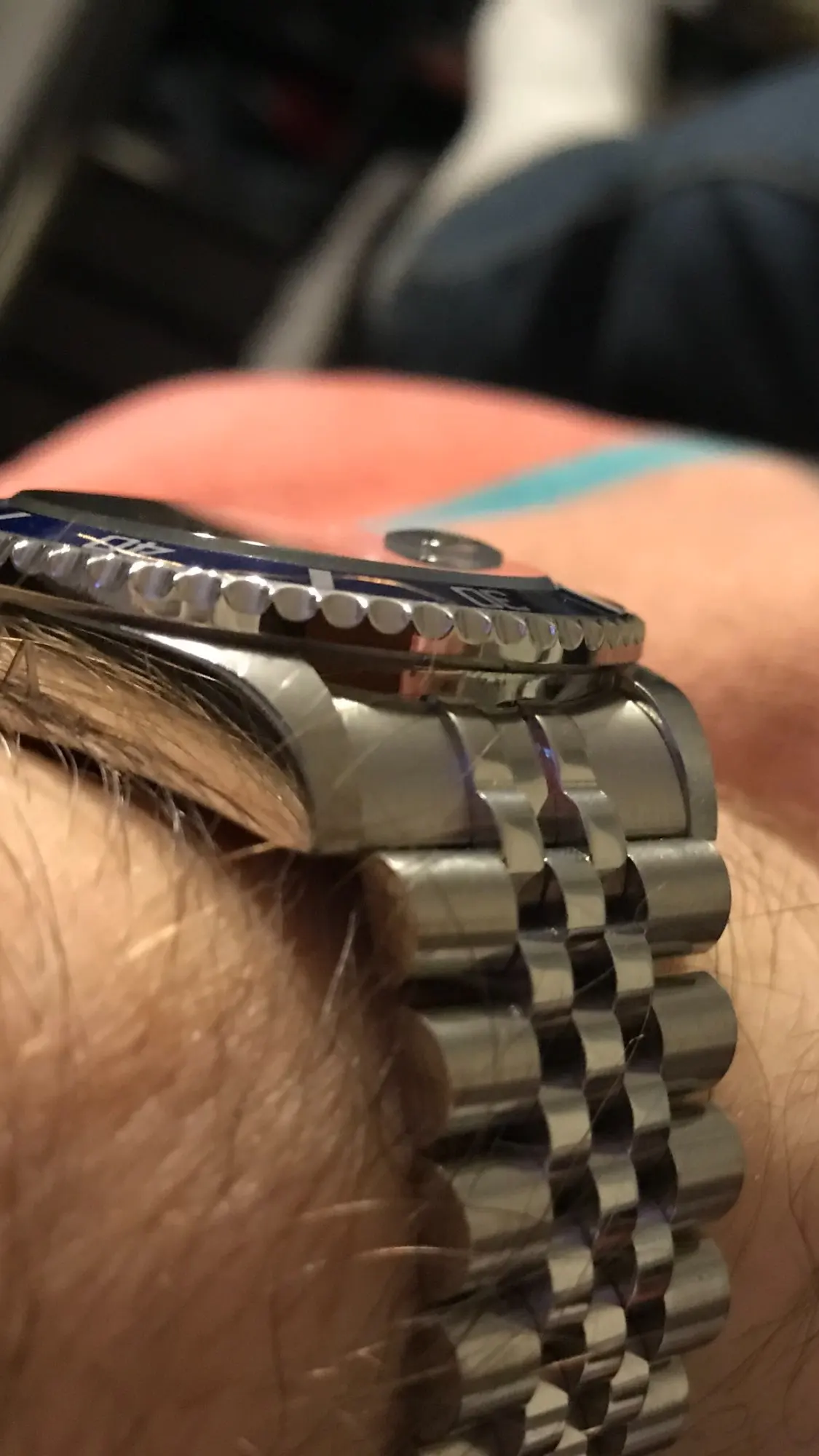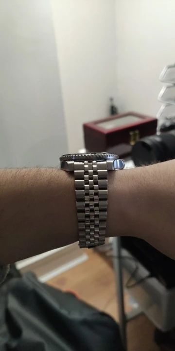 В Инвикту (в хомаж Субмаринера) зашел еле еле. При этом видно, что с геометрией ушек не очень совпало. Между безелем и браслетом видно 2-3мм корпуса. И изгиб ушек примерно на 1мм толще, чем браслет. Пластина защелки стоит как то криво, ее видно из под застегнутого браслета. Шпилька, закрепляющая браслет к застежке, была не завинчена и выпала. Завернул, пока вроде держится.