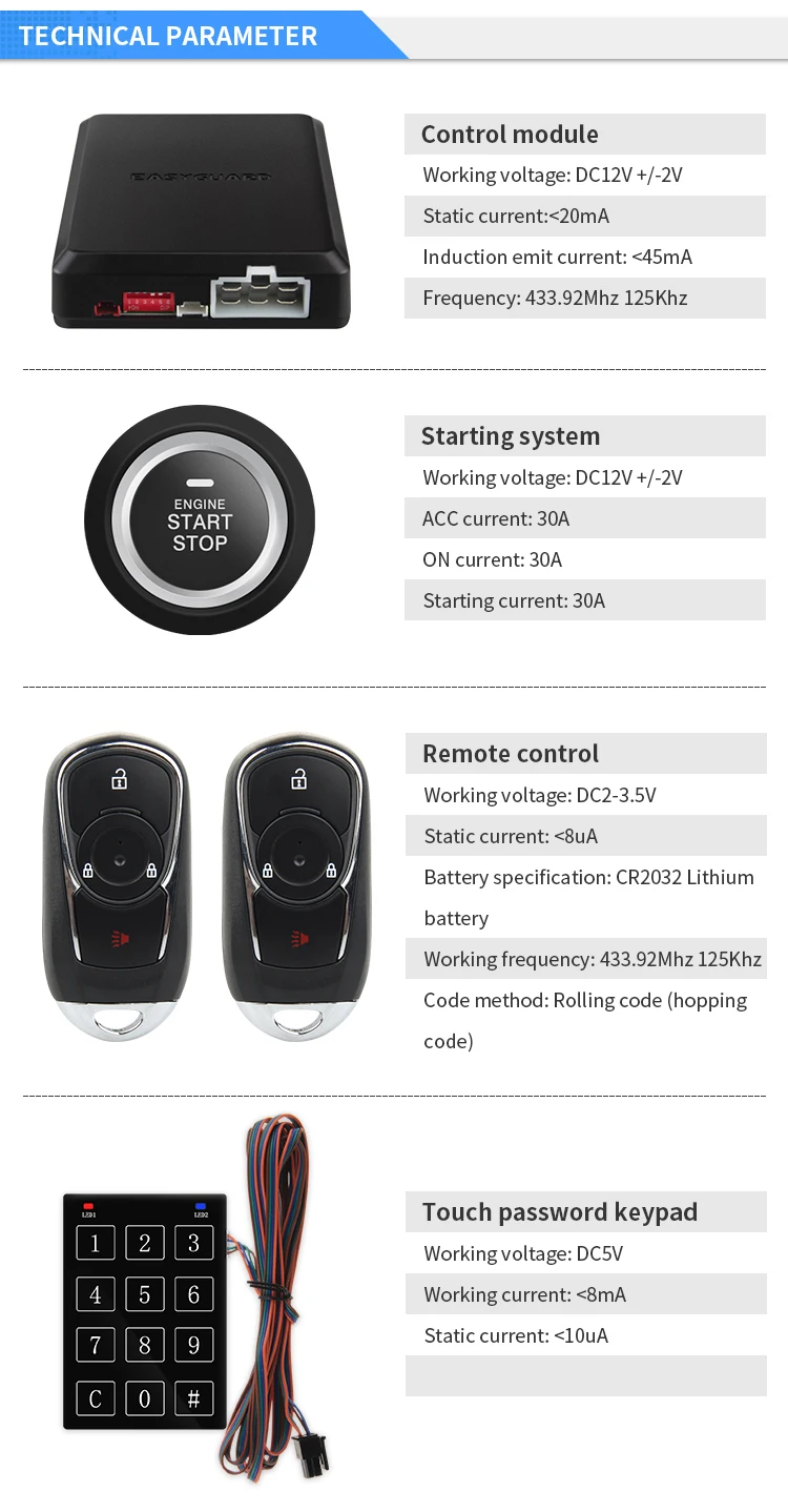 Блокировка EASYGURD, разблокировка PKE, автомобильная система сигнализации сенсорный ввод пароля, кнопка запуска, удаленный запуск двигателя, секундомер