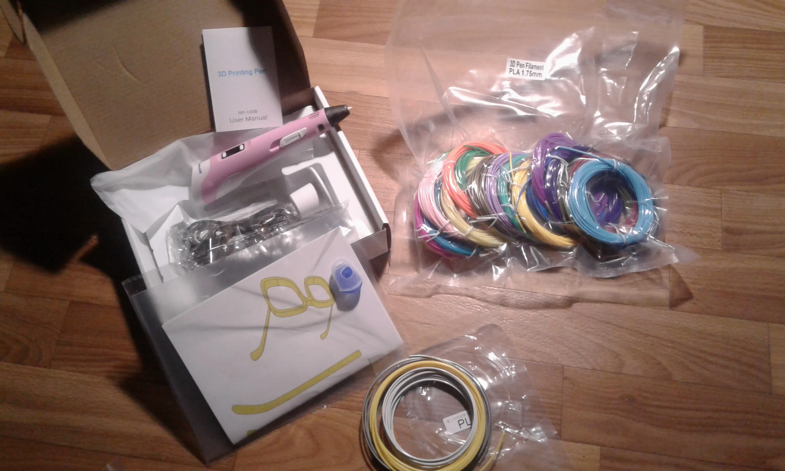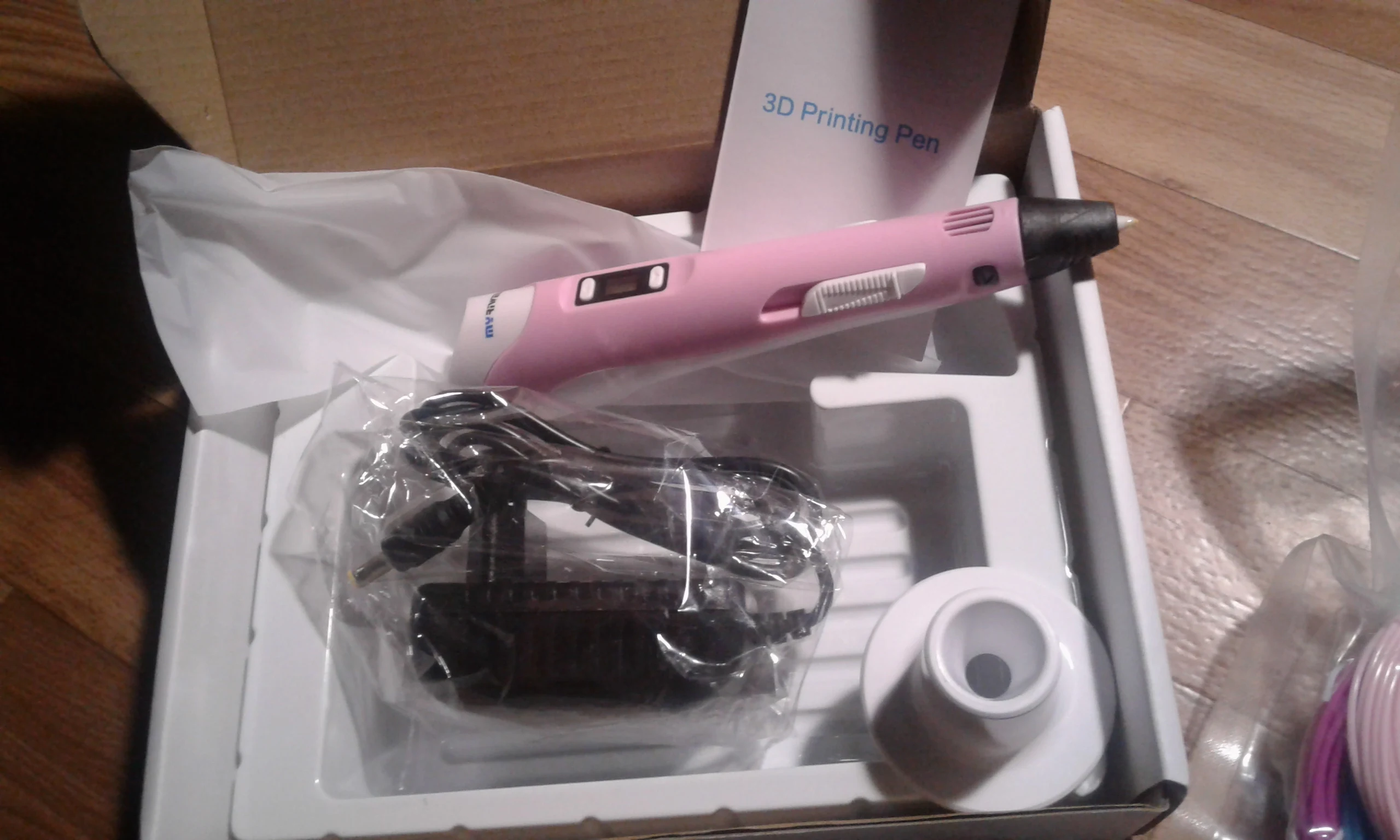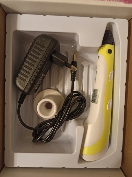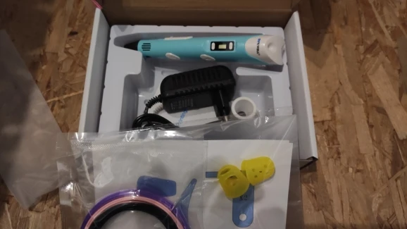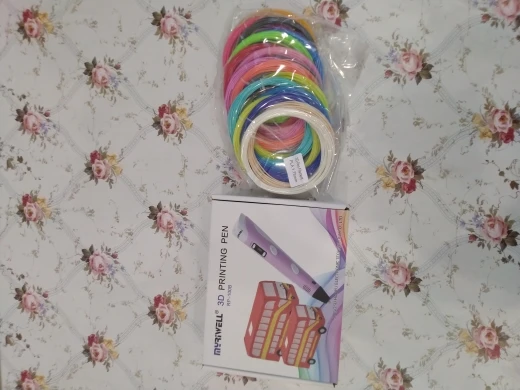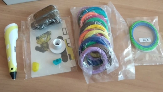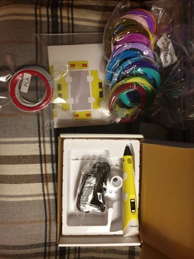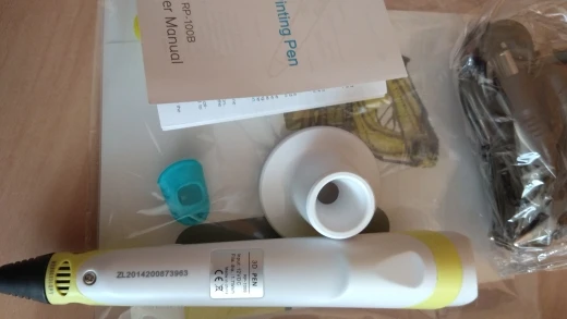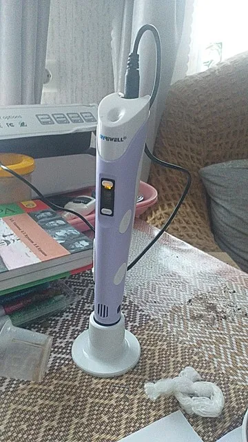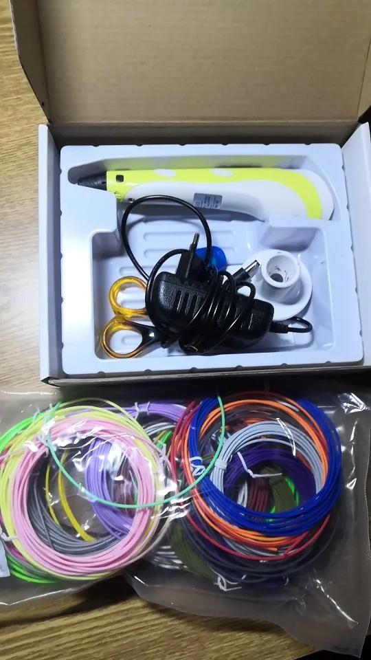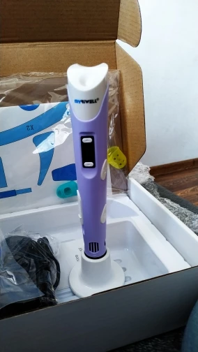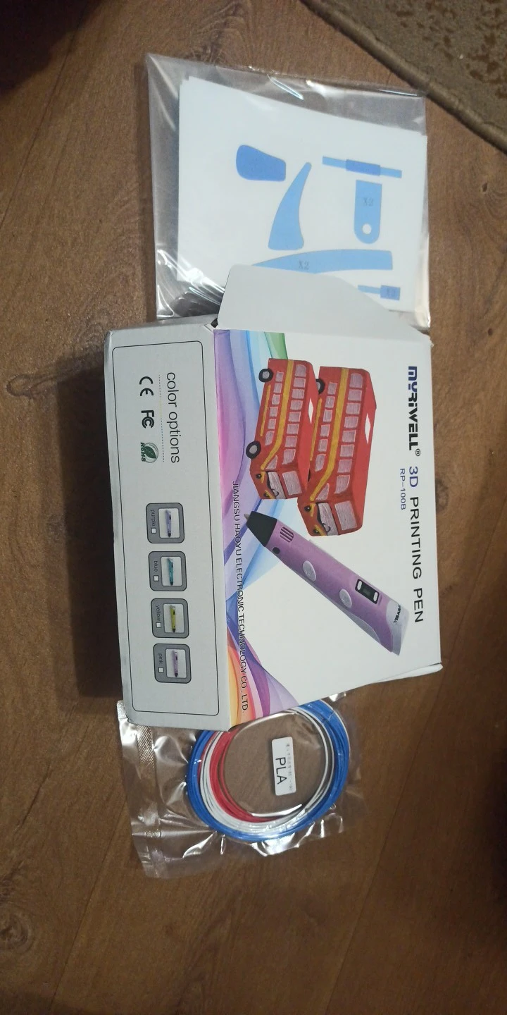 Доставка на почту менее чем за 2 недели (Standard Shipping, Москва). Упаковано хорошо, в несколько слоёв пузырчатой плёнки. Комплектация: ручка, адаптер (12V-2A), подставка, комплект PLA-пластика трёх цветов (чёрный, белый, серый, 9 м, диаметр 1.75 мм), два силиконовых напальчника, лист матового пластика 20х16 см, два листа с примерами моделей, инструкция на англ. языке. Качество ручки отличное, работать ей удобно. На корпусе есть регулятор скорости подачи пластика, а также имеется функция сна, если ручка не используется более 2 минут. Рабочая температура - 210℃ для ABS, 185℃ для PLA. Поставил 4 звезды из-за того, что в заказанной мною опции "Purple EU-100m ABS" не оказалось пластика чёрного цвета, хотя по фото товара я был уверен, что он будет в комплекте! Зачем мне пять оттенков красного, если основной рабочий цвет - чёрный?! За это минус балл. В целом, рекомендую товар и продавца!