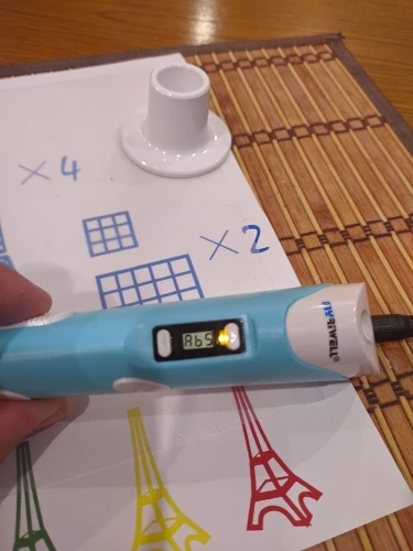 ручка соответствует описанию, ребенок доволен, а это самое главное, покупала м дополнительным наборном пластика, а то а комплекте быстро закончился. установила температуру меньше, чтоб быстрее застывал и не тянулся. Чтоб не обжечь пальцы, есть напальчники, инструкция на английском. скорость подачи регулируется ползунком. Покупкой довольна.