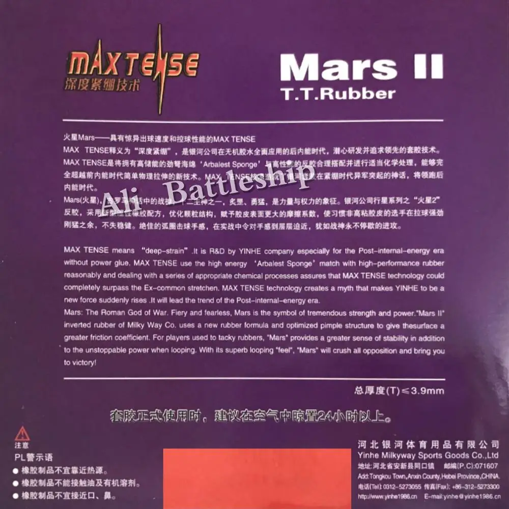 Марс: Римский Бог войны. Огненный и бесстрашный, Марс является символом огромной силы и силы. «Mars2» перевернутая Резина Milky Way Co. использует новую резиновую формулу и оптимизированную прыщей структуру, чтобы придать поверхности больший коэффициент трения. Для игроков, используемых для борьбы с каучуками, «Mars» обеспечивает большее чувство стабильности в дополнение к неудерживаемой мощности при лопинге. Благодаря своему превосходному наклонению «feel», «Mars» сокрушит любую оппозицию и приведет вас к победе!