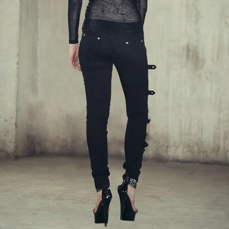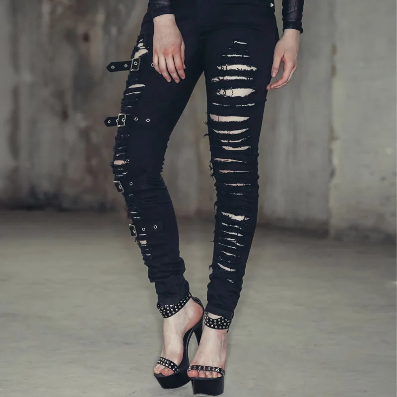 Модные женские рваные хлопковые брюки Devil в стиле стимпанк с пряжкой готические черные повседневные джинсы длинные брюки