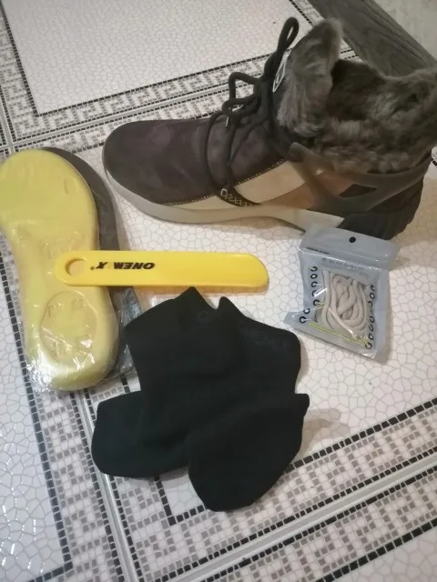 Маломерит на размер. Соответствует описанию, комплект полный - ложка, шнурки, сменные стельки, носки. Правда надевать и снимать туговато, так как нет замка. Коротковаты ботинки, при ходьбе камушки залетают внутрь.