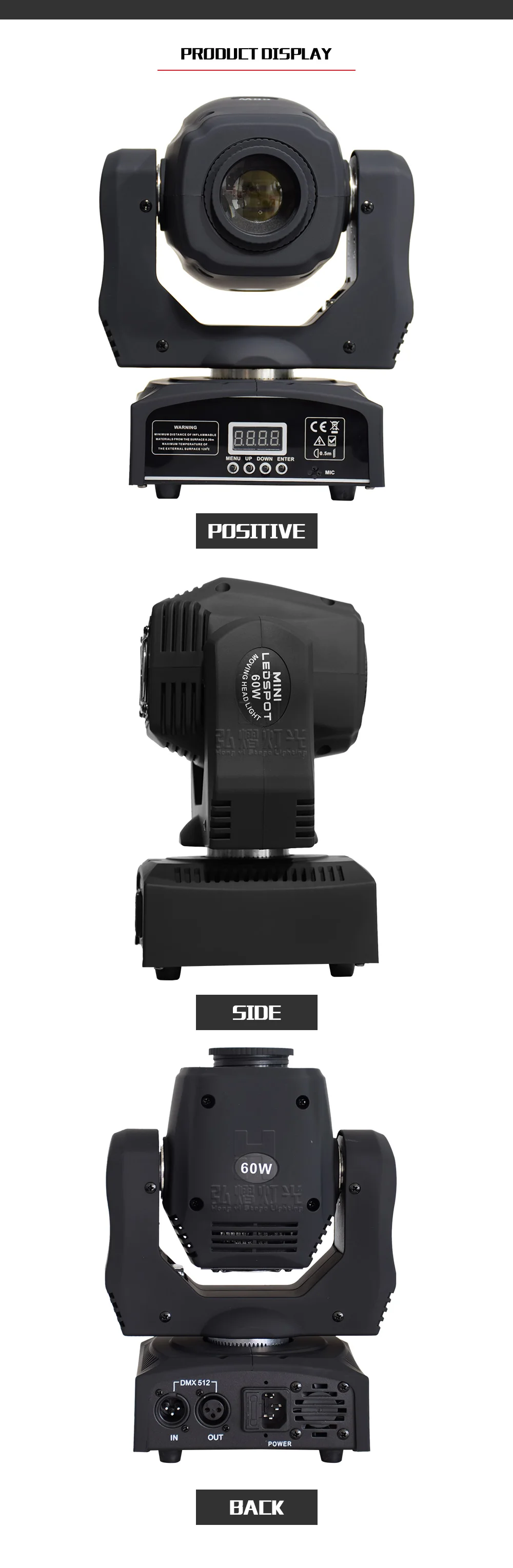 1. Тип товара: сценическое освещение2. Повод: для профессиональной сцены и диджеев3. Стиль: мини4. Мощность: 100 Вт5. Напряжение: AC100-240V 50-60 Гц6. Светодиодный: 60 Вт белый светодиодный s7. Режим воспроизведения: Автоматический запуск, Sound-8.activated,DMX512, master-slave9. Встроенные программы: стандартный, сценический, ТВ, 10. Архитектурный и театральный режим.Канал управления: 11 каналов11. Затвор: переменная от 1-25 вспышек или случайного стробоскопа12. Затемнение: 0-100% линейное затемнение13. Угол луча: 10 °14. Фокус: ручной фокус15. Движение панорамирования: 540 °, скорость может контролироваться.16. Движение наклона: 180 °, скорость можно контролировать.Плата дисплея: цифровой дисплей трубки17. Колесо Gobo: 7 gobo + open, эффект gobo - flow, дрожание gobo18. Цветовое колесо: 7 цветов + открытый, эффект радужного потока19. Люмен (лм):20500 Люкс @ 1 м20. Размер корпуса: 170x150x190мм21. Вес брутто: 4,5 кг22. Товар: дискотечный светильник/светильник, музыкальный светильник23. Для: Dj светильник s/сценический светильник/вечерние светильник s