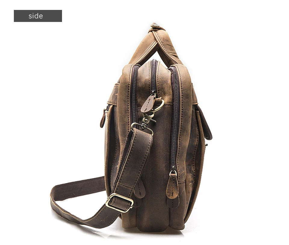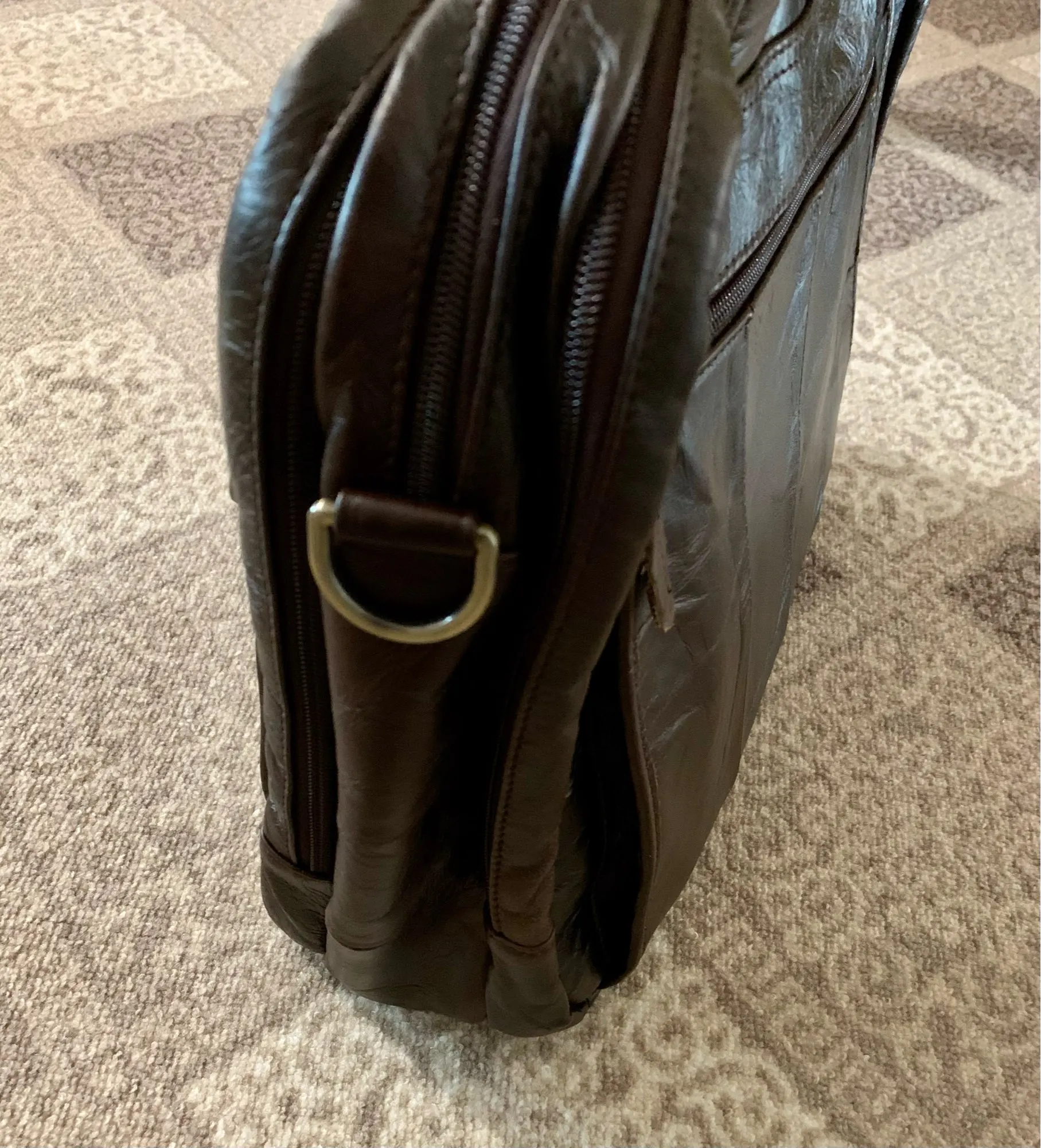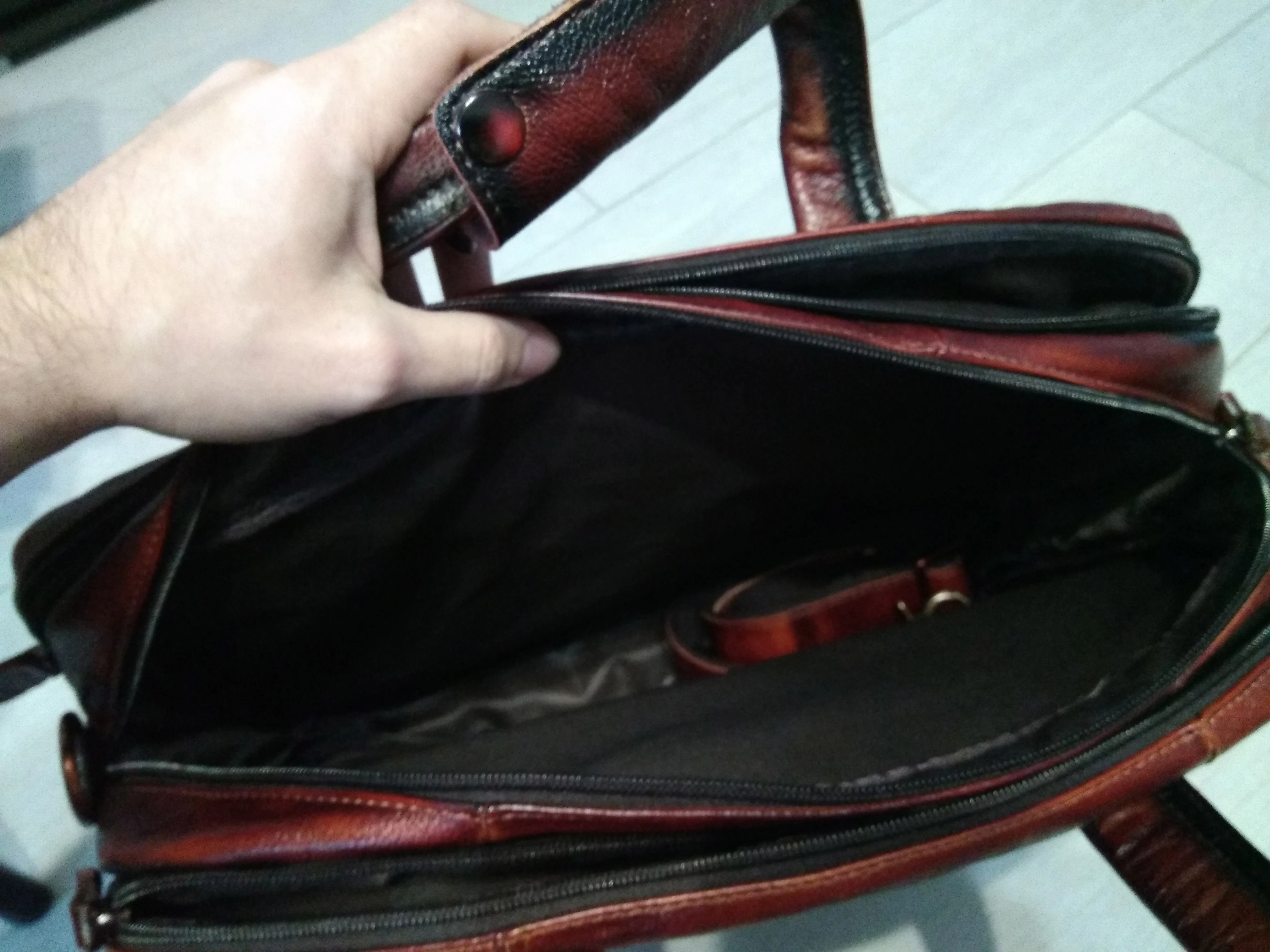 Хорошая удобная вместительная сумка. Кожа достаточно толстая и крепкая, хоть и есть претензии к ее покраске. Ноут 15,5 помещается прям в кожаном чехле с мышкой и зарядкой и закрывается на молнию без усилий. Теперь ее можно спокойно бросать на заднее сиденье или вообще в багажник с водительского места не боясь за ноут.