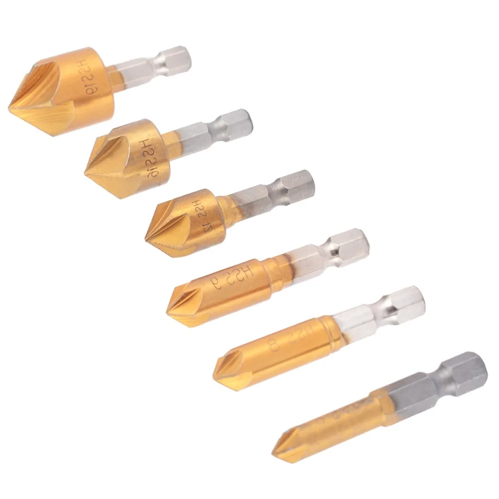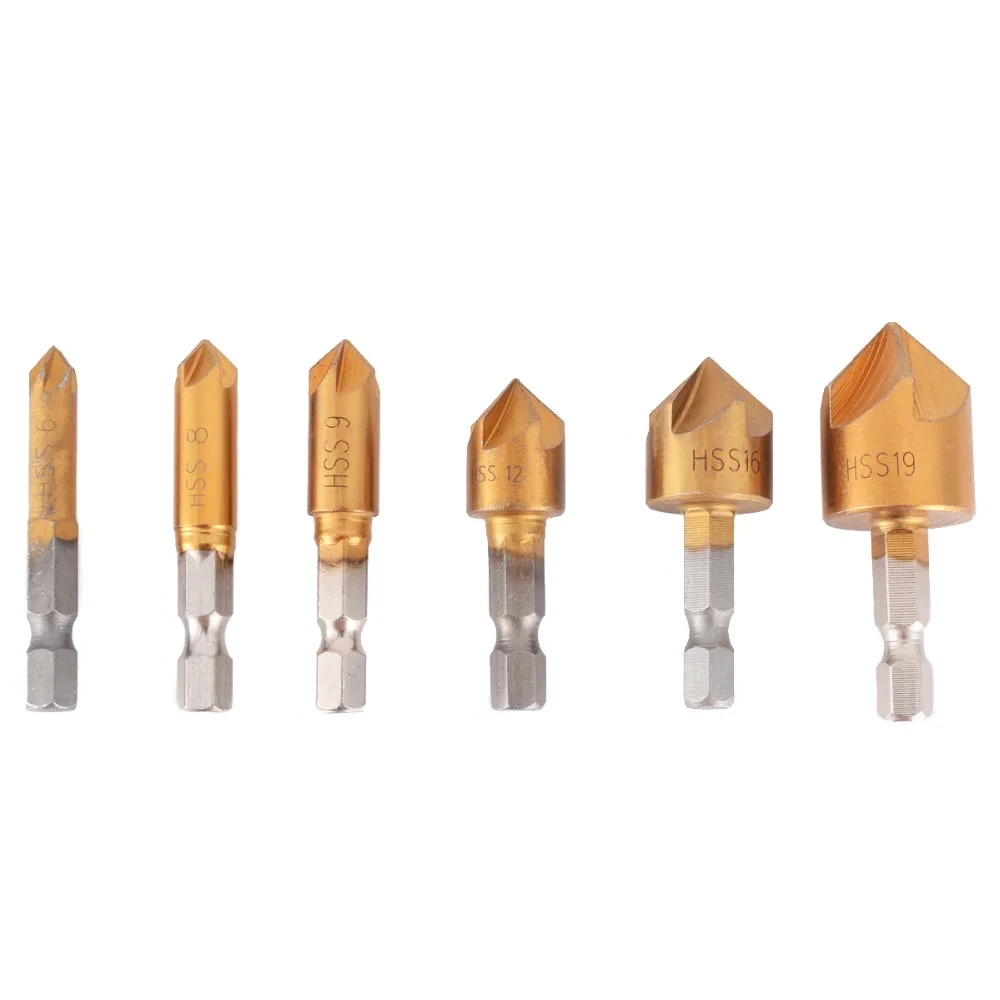 Набор сверл с зенковкой, 6 шт.компл., 5 канавок, 90 градусов, шестигранный хвостовик, фреза, 6-19 мм, для электроинструментов