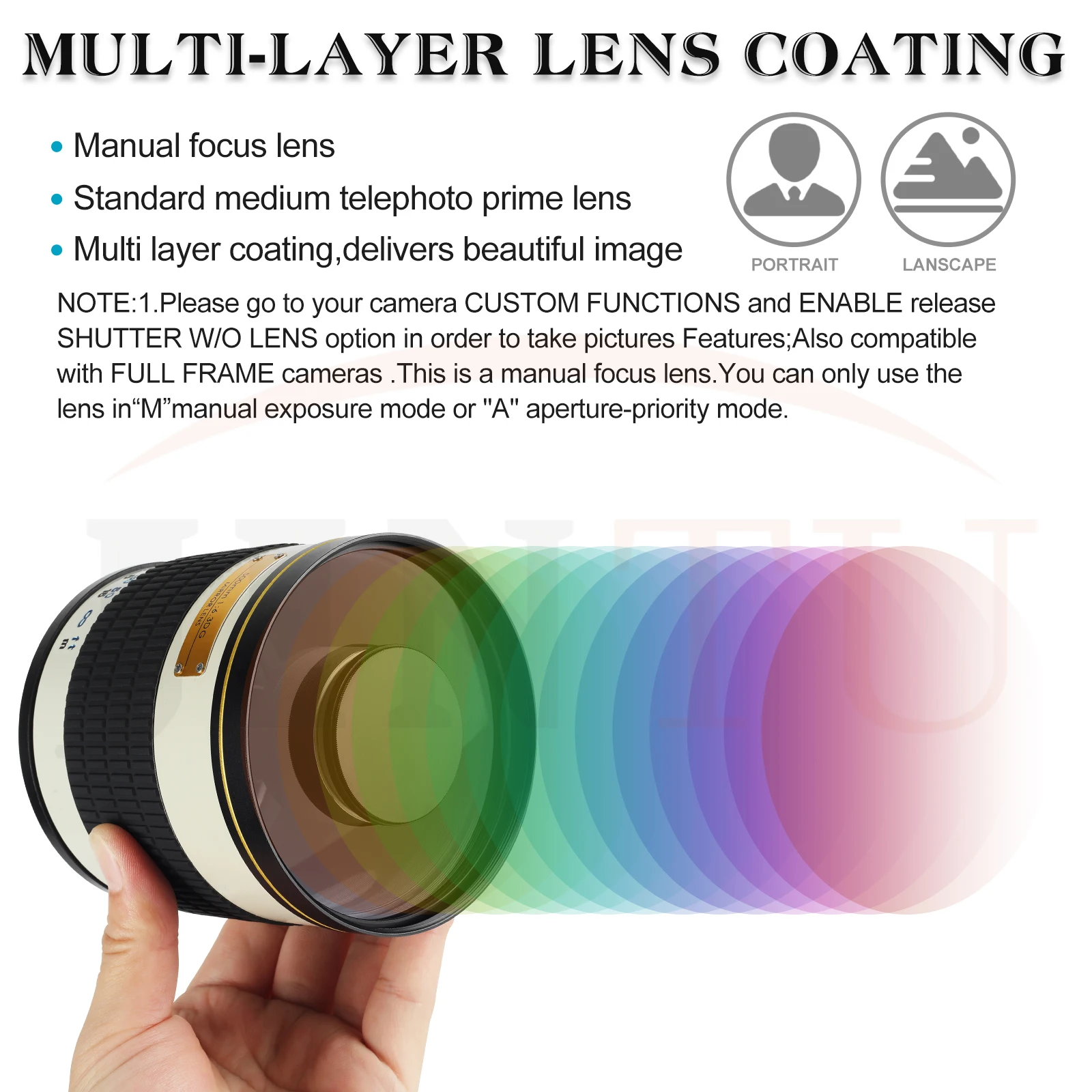 Характеристики:* Тип линз: зеркальные линзы* Тип фокусировки: ручная фокусировка* Профессиональный Высококачественный объектив* Конструкция:7 элементов в 6 группах* Угол обзора: 5 °* Диапазон f/Stop: f/6,3 (фиксированный)* Минимальная фокусировкаРасстояние: 6,1 фута* Размер фильтра: 34 мм (сзади) спереди 95 мм* Диаметр x Длина, вес: ø 77x87,5 мм, 330 г* Модель: JT-500F6.3W* Цвет: белый* Бренд: Jintu
