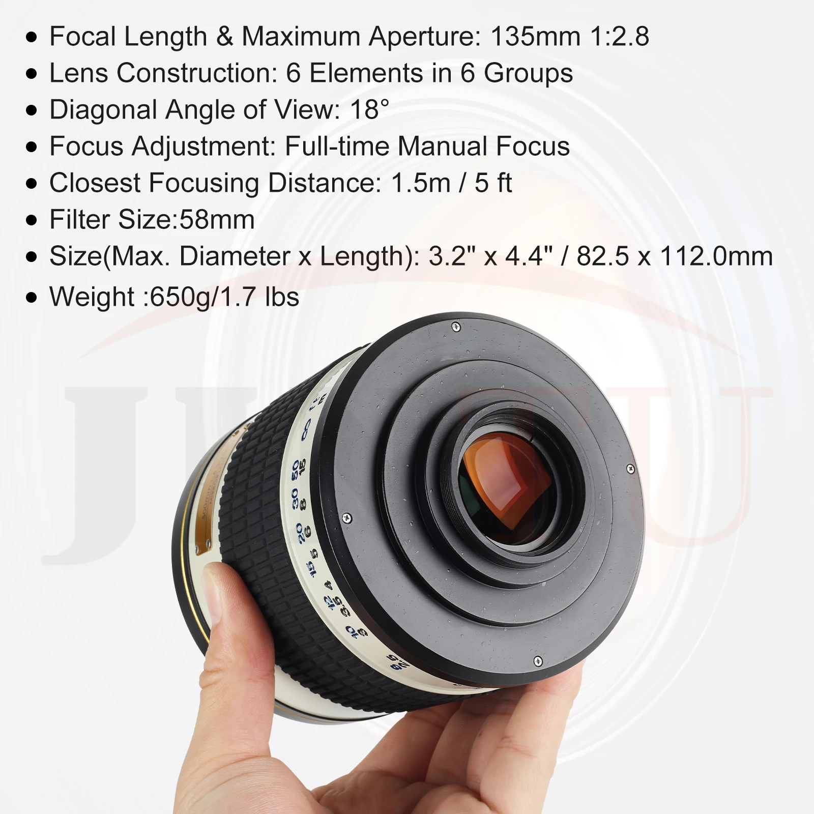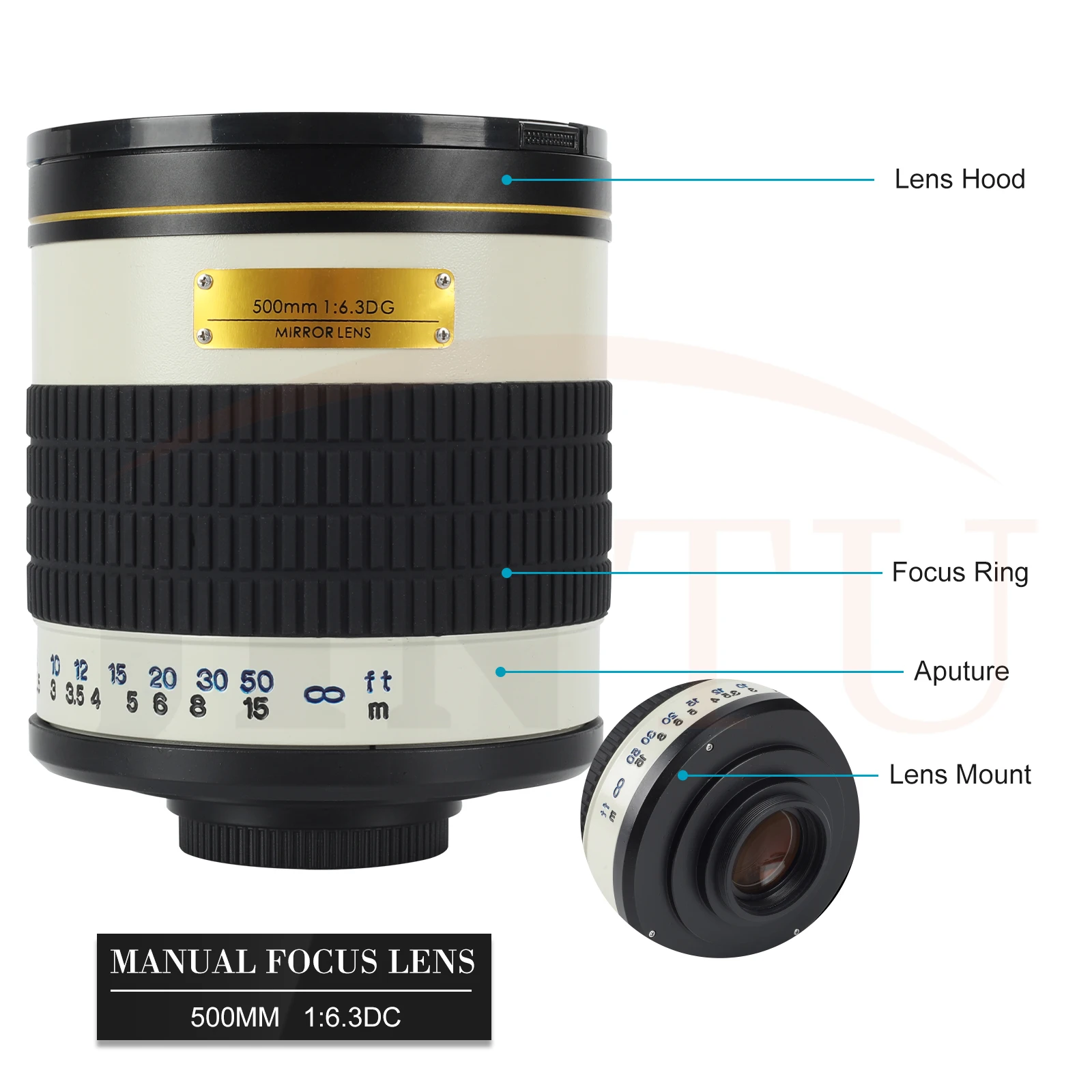Характеристики:* Тип линз: зеркальные линзы* Тип фокуса: ручной фокус* Pro Высококачественный объектив* Конструкция:7 элементов в 6 группах* Угол обзора: 5 °* F/стоп диапазон: f/6,3 (фиксированный)* Минимальная фокусировкаРасстояние: 6,1 футов* Размер фильтра: 34 мм (задняя) Передняя 95 мм* Диаметр x Длина, вес: ø 77x87,5 мм, 330 г* Модель: JT-500F6.3W* Цвет: белый* Бренд: Jintu
