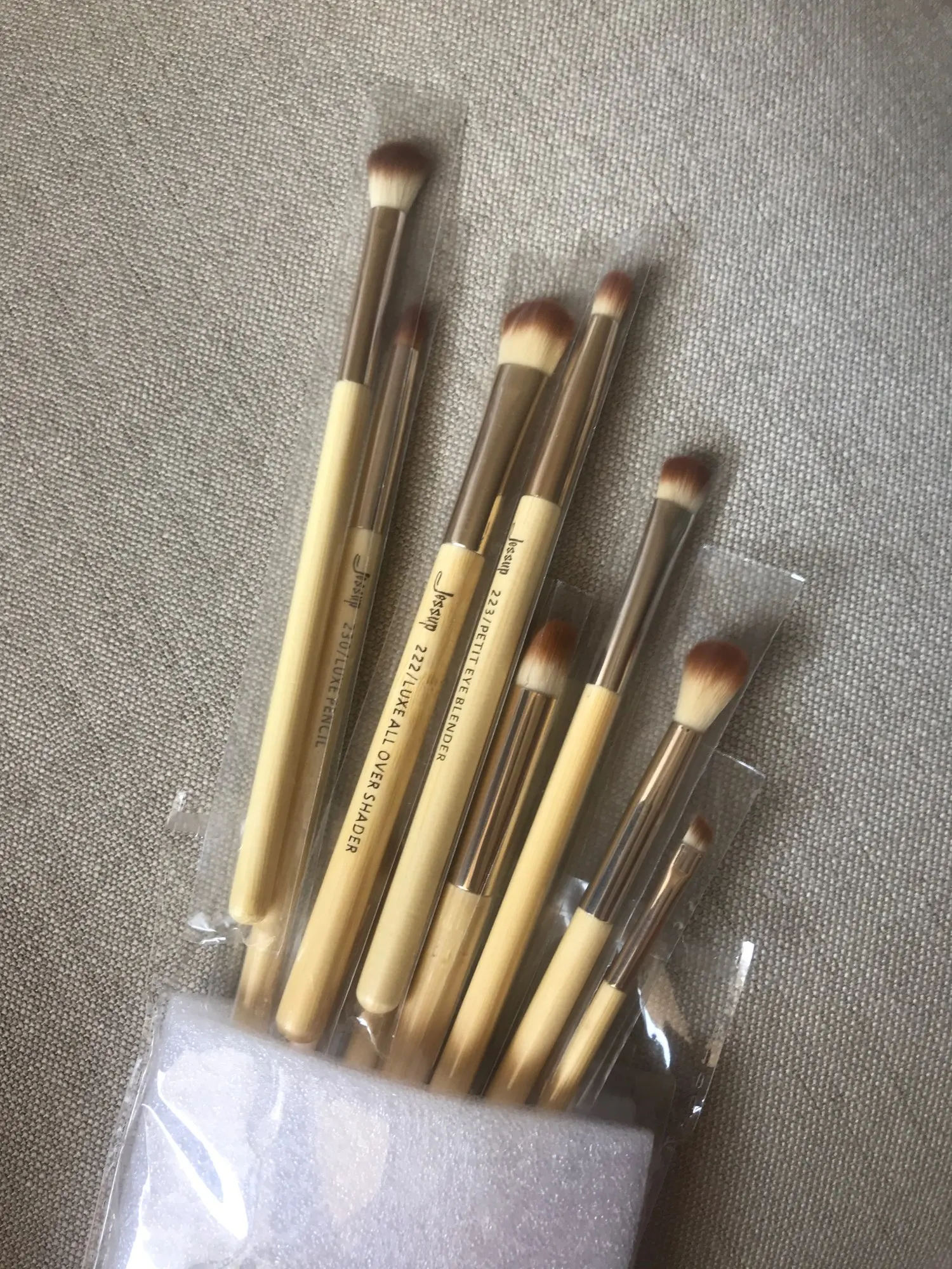 Кисти, кажется, очень хорошего качества. Я думаю, что волосы синтезированы, но они очень красивые и мягкие (как мех молодой кошечки). Это не раздражает кожу, когда я прикасайся к концам кистей, как и многие кисти, поэтому они должны быть очень нежными для кожи глаз. Бамбуковые держатели мягкие, но прочные (а также экологичные, что является еще одним преимуществом!). Я могу их порекомендовать :)