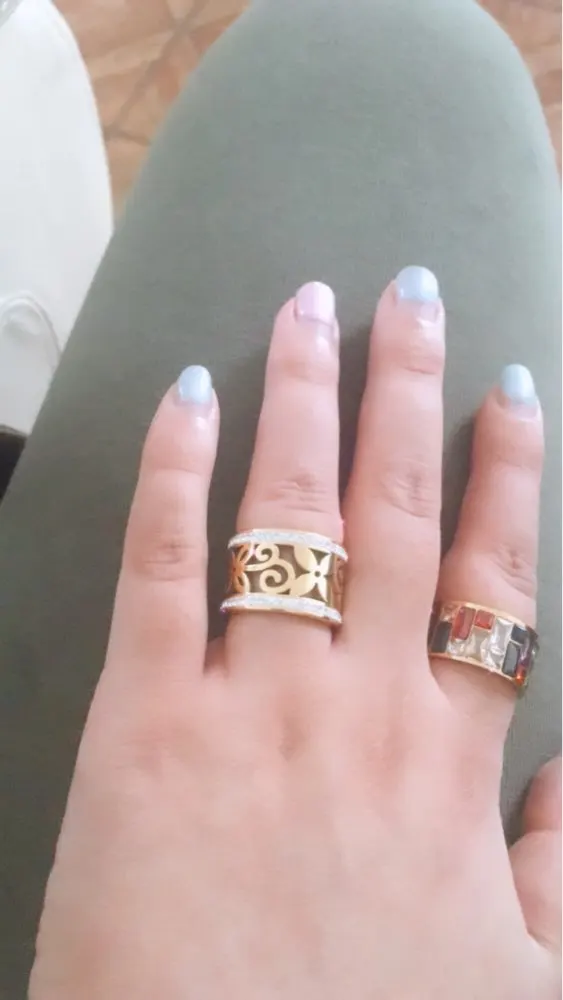 Хорошее кольцо. Увы, самый маленький размер был велик мне даже на большом пальце, но погуглила способы "уменьшить" кольцо, приклеила изнутри силиконовую подушечку, и всё, можно носить на каком угодно пальце)