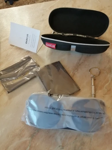 Очки классные, качественные, с твёрдым и мягким чехлами в комплекте, так же салфетка и тест на поляризацию, есть отвертка и упаковано все в коробку, очень довольна покупкой