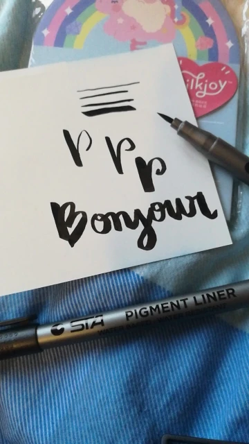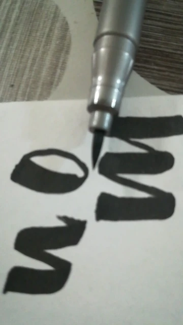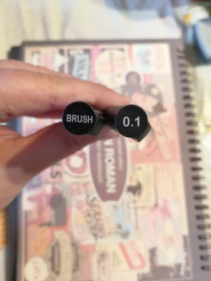 не посмотрела описание, немного тонковат на мой вкус, но кончик гибкий, бумага не промокает, на следующем листе нет отпечатка(обычная бумага для принтера), писать очень приятно