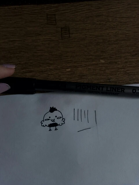 Пришел за чуть меньше месяца, честно, я ожидала хужшего, но он отличный, на фото есть размазанные линии, я проверяла на размажистость сразу после нарисование, и это круто что быстро сохнет, в пример привела ниже нарисованную курочку, своим самым дешманским гелевой ручкой0.5 и она мне воообще не нрав, и по фото не видно но моя гелька оказывается даже не черная, как афишируется, а темно-темно синяя, + держать вот эту 0.3 удобнее ВЫВОД: СОВЕТУЮ, РЕКОМЕНДУЮ, ОСОБЕННО ЗА ТАКУЮ ЦЕНУ