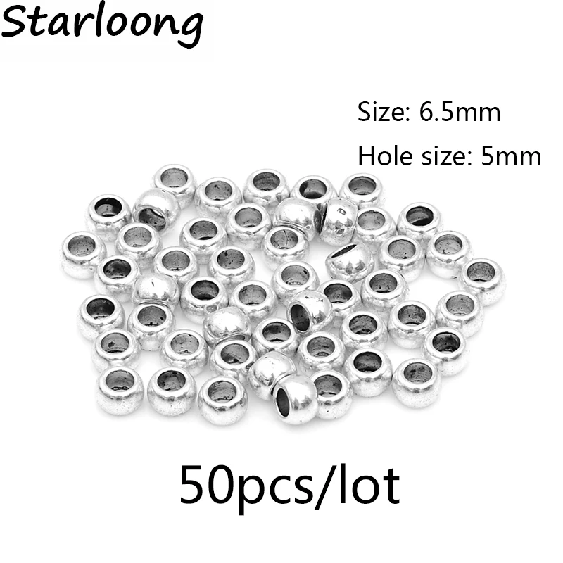 50 шт./лот, цинковый сплав, античный, винтажный, посеребренный, Круглый, большое отверстие, разделитель, бусины, сделай сам, изготовление ювелирных изделий для европейского и американского стиля, ожерелье, браслетРазмеры: 6,5 ммРазмер отверстия: около 5 ммМатериал: цинковый сплавКоличество: 50 шт.