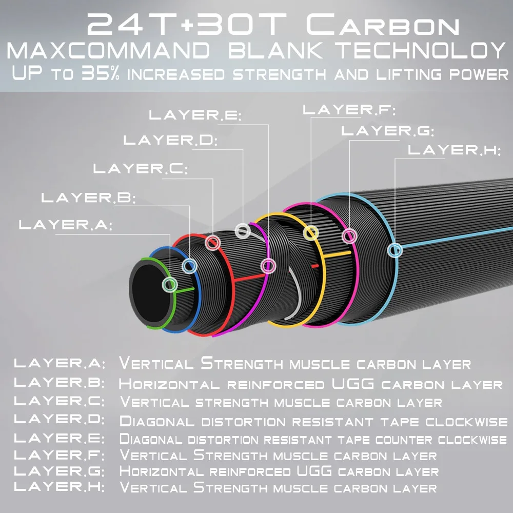 Эксклюзивная пустая технология MAXCOMMAND-Чистый 24T смешанные 30T углеродное волокно. С смешанными 7 слоями углерода, включая усиленный мышечный углеродный слой, для по крайней мере 25% повышения производительности литья. Различные стержни даже включали версии путешествий, которые легко попасть в ваш рюкзак.