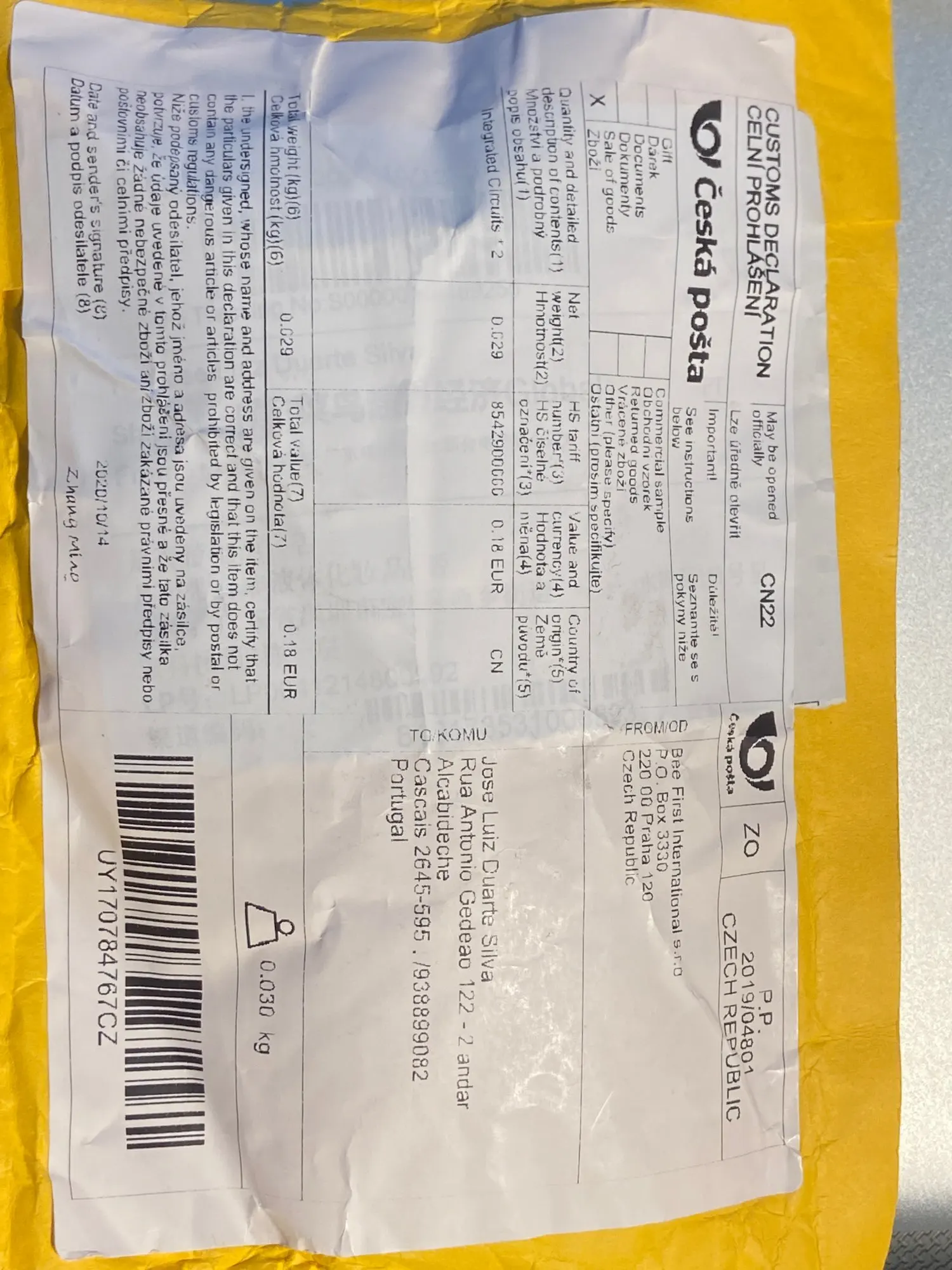 Страна: CZ Доставка: Cainiao Super Economy Global 24.12.2020