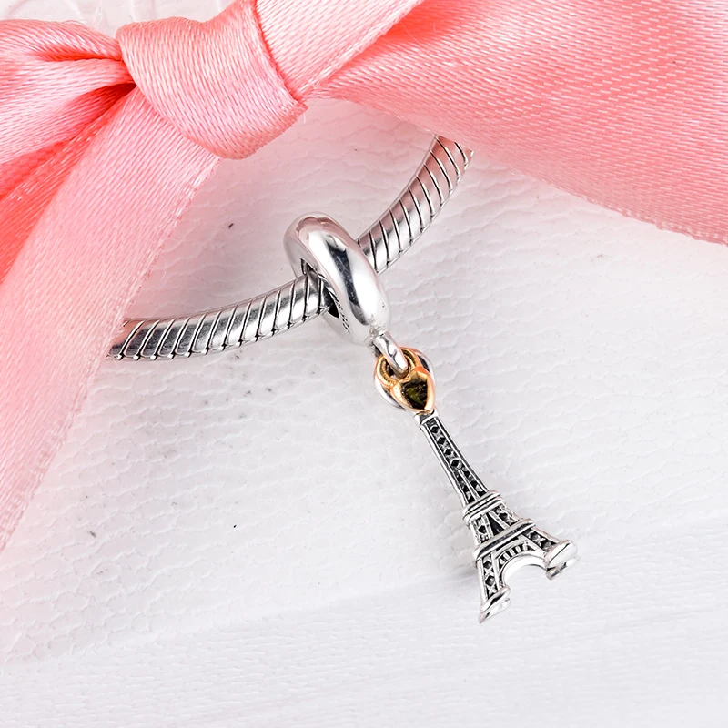 Подходит для Pandora Браслеты Эйфелева подвески в виде башни с изображением золотых сердец 100% стерлинговые Серебряные бусы, бесплатная доставка