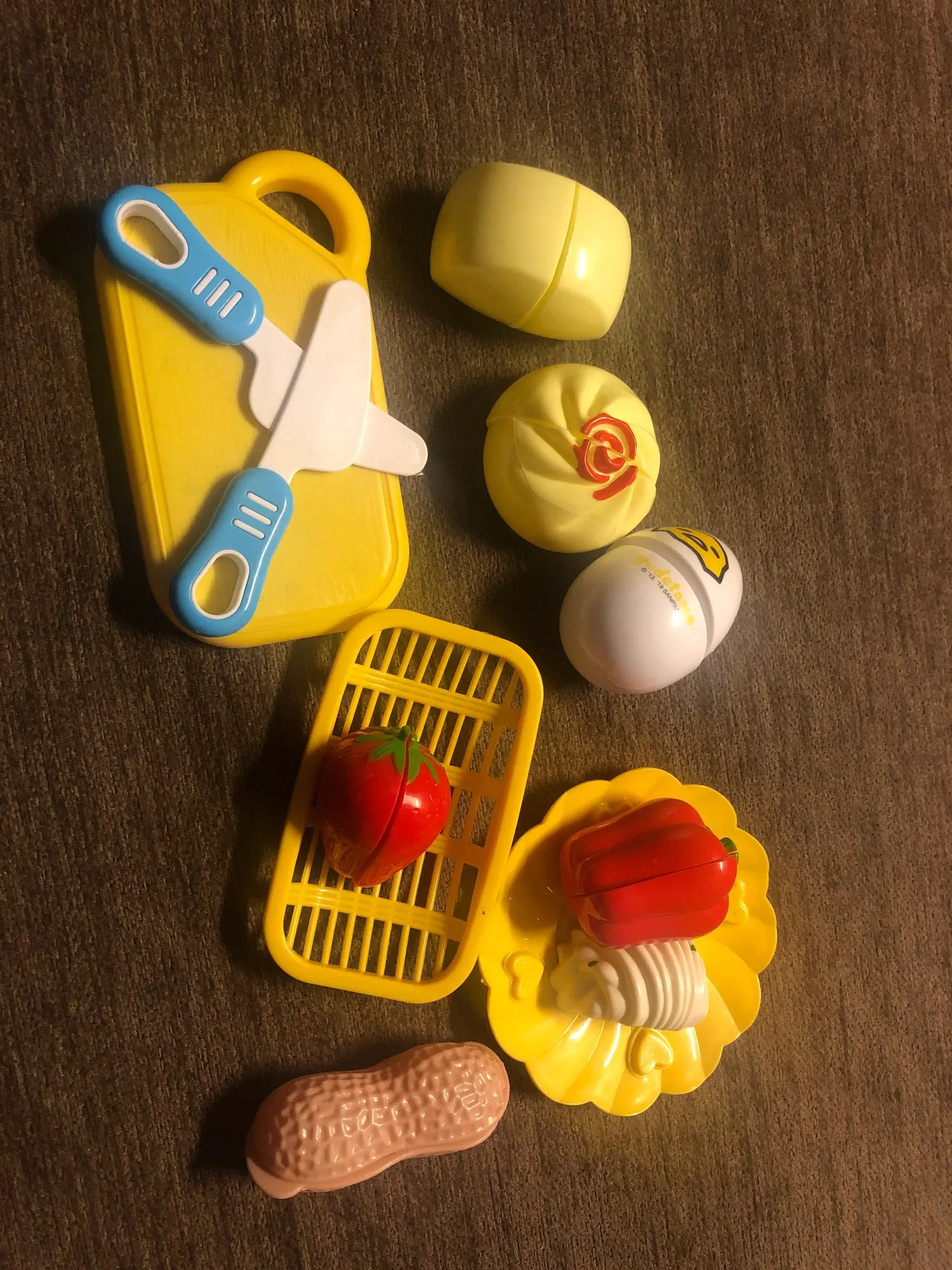 Пару овощей или что это вообще не понятно ) на липучки . Липучки сильные . Я думала побольше в наборе игрушек . Мне кажется не 12 штук . Пришёл быстро товар . На пункт выдачи в пятёрочку