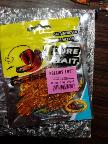 Дошло за 5 недель. Не такие мягенькие как Поларис оригинальный, но в целом норм. Что удивительно, у меня есть такие же приманочки в цвете СА-35, так вот они значительно мягче. Запах нормальный, химию не почувствовал. Цвет ожидал несколько иной. Оказался прозрачный темно-карамельный, с золотистыми блестками.