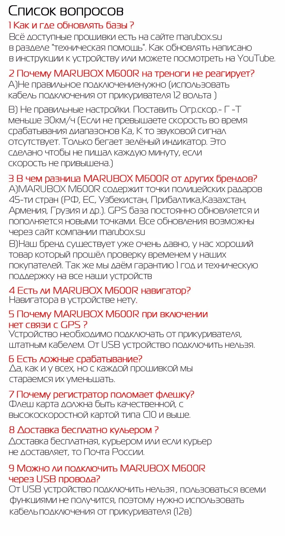21.10.21 заказал Marubox M600R signature со скоростной microSD 64 Гб, 28.10.21 доставил курьер ТК СДЭК до квартиры. В приборе база от 07.2021. Обновил до 10.2021 с оф.сайта marubox.su. Спутники определяются быстро, радары фиксируются как надо. Удачная модель! Продавца и устройство рекомендую!
